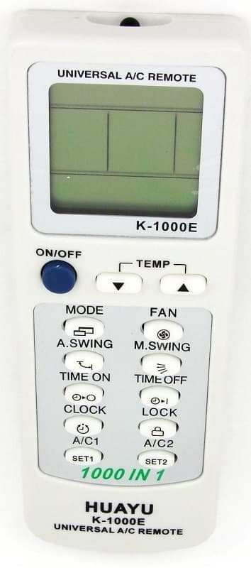 Универсальный пульт для кондиционеров HUAYU K-1000E. Этот пульт обладает большой базой кодов, он поддерживает 1000 различных моделей кондиционеров. Пульт подходит для кондиционеров следующих производителей: