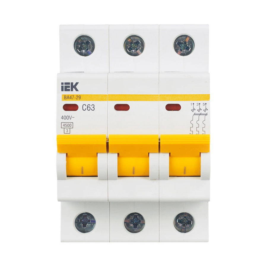 Автоматический выключатель ВА47-29 предназначен для защиты распределительных и групповых цепей, имеющих различную нагрузку. Кол-во полюсов - 3, номин. ток - 63 A.