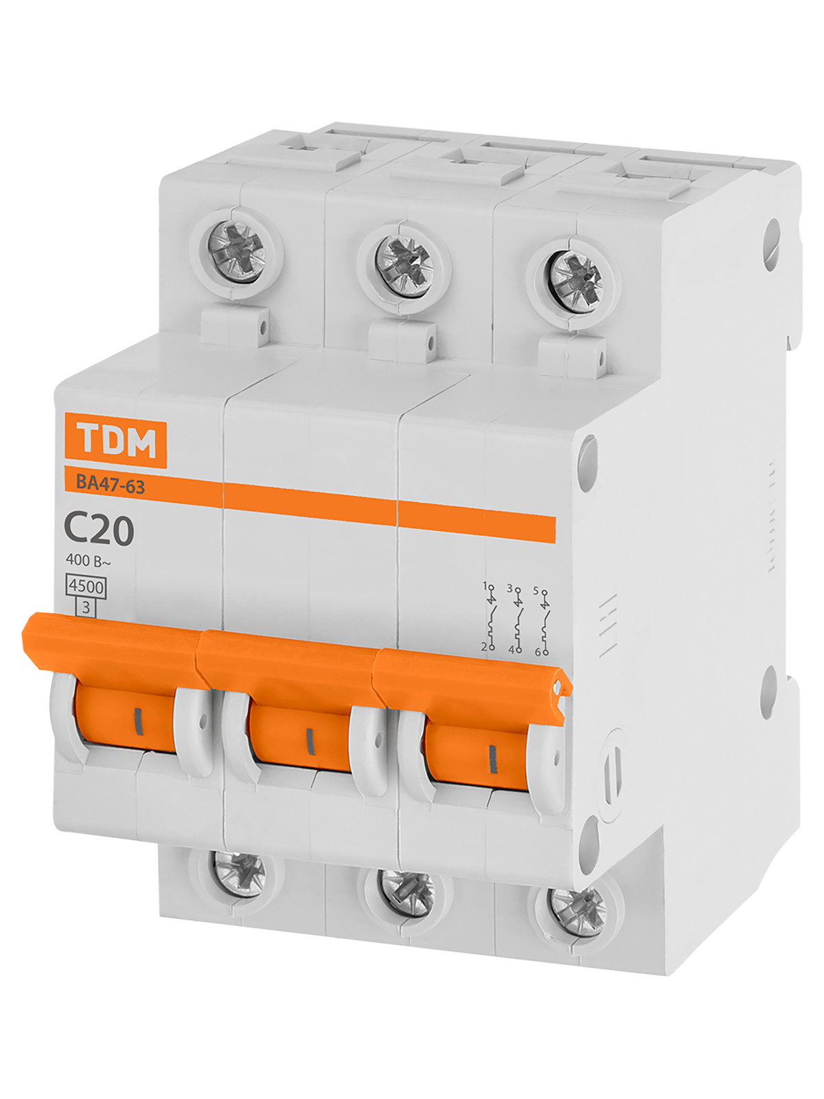 Автоматические выключатели серии ВА47-63 предназначены для защиты сетей от перегрузок и короткого замыкания и рассчитаны на номинальные токи от 6 и до 63 А при отключающей способности 4,5кА. Корпус и детали выключателей выполнены из пластика, не поддерживающего горение. Выключатели поставляются в одно-, двух- и трехполюсном исполнении. Характеристика кривой отключения – С. Автоматические выключатели ВА47-63 могут устанавливаться в любом положении без изменения их номинальных характеристик. Подвод питающей линии может производиться как через верхние, так и через нижние клеммы, без нарушения работоспособности.