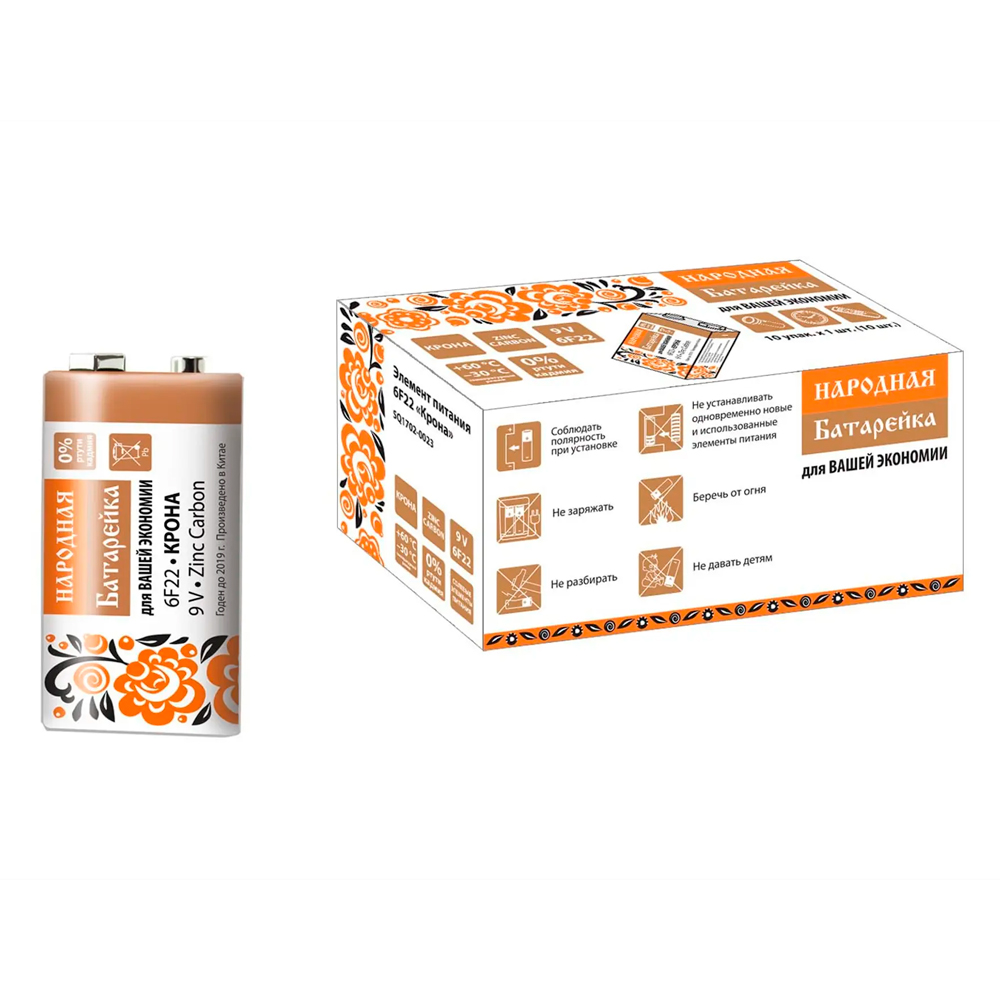 Батарейка 6F22 "Крона" Zinc Carbon 9V SH-1 - предназначена для автономного питания профессиональных и бытовых устройств. Подходит для устройств с высоким и среднем энергопотреблением: магнитофоны, игрушки на пульте управления, фонари и т.д., а также для устройств с низким потреблением: настенные часы, пульты дистанционного управления и т.п.