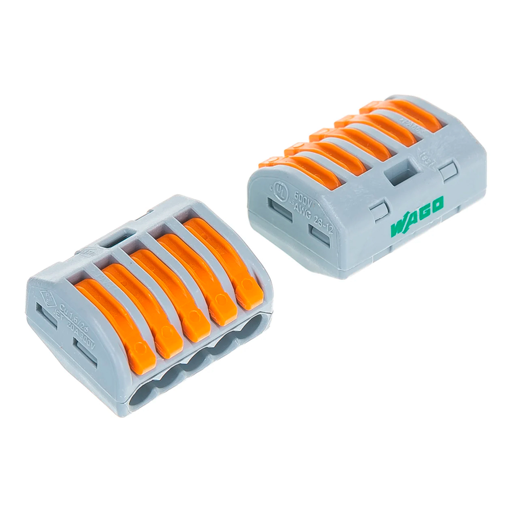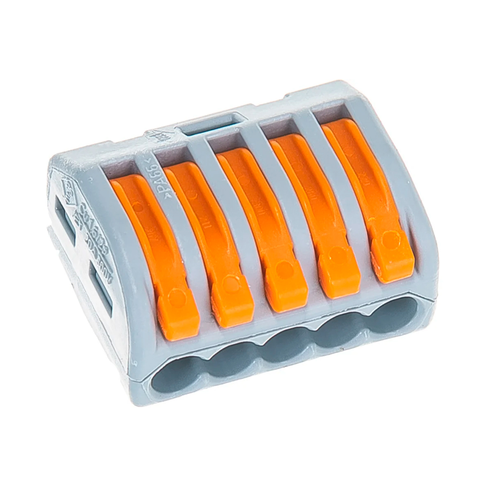 Соединительная клемма с рычажком WAGO 222-415 5-ти проводная, 0,08-2,5 кв.мм, 400В, 32А, без пасты. Изготовлена из пластика, который способен изолировать проводники и обезопасить использование. Изделие служит для присоединения пяти медных проводов. Рычажки предназначены для надежного зажима кабелей.