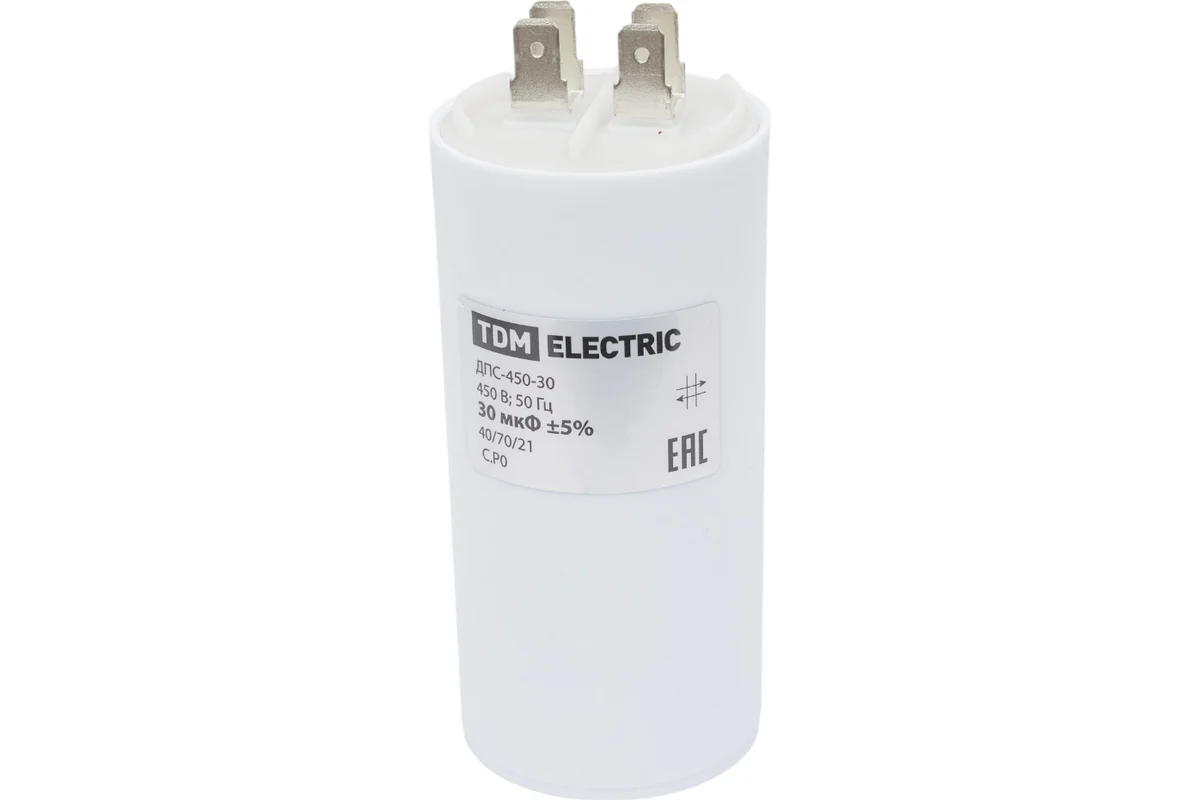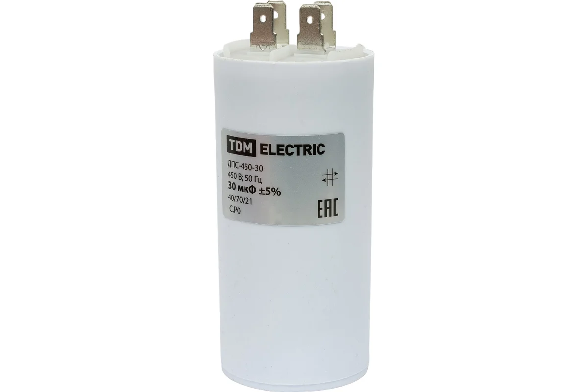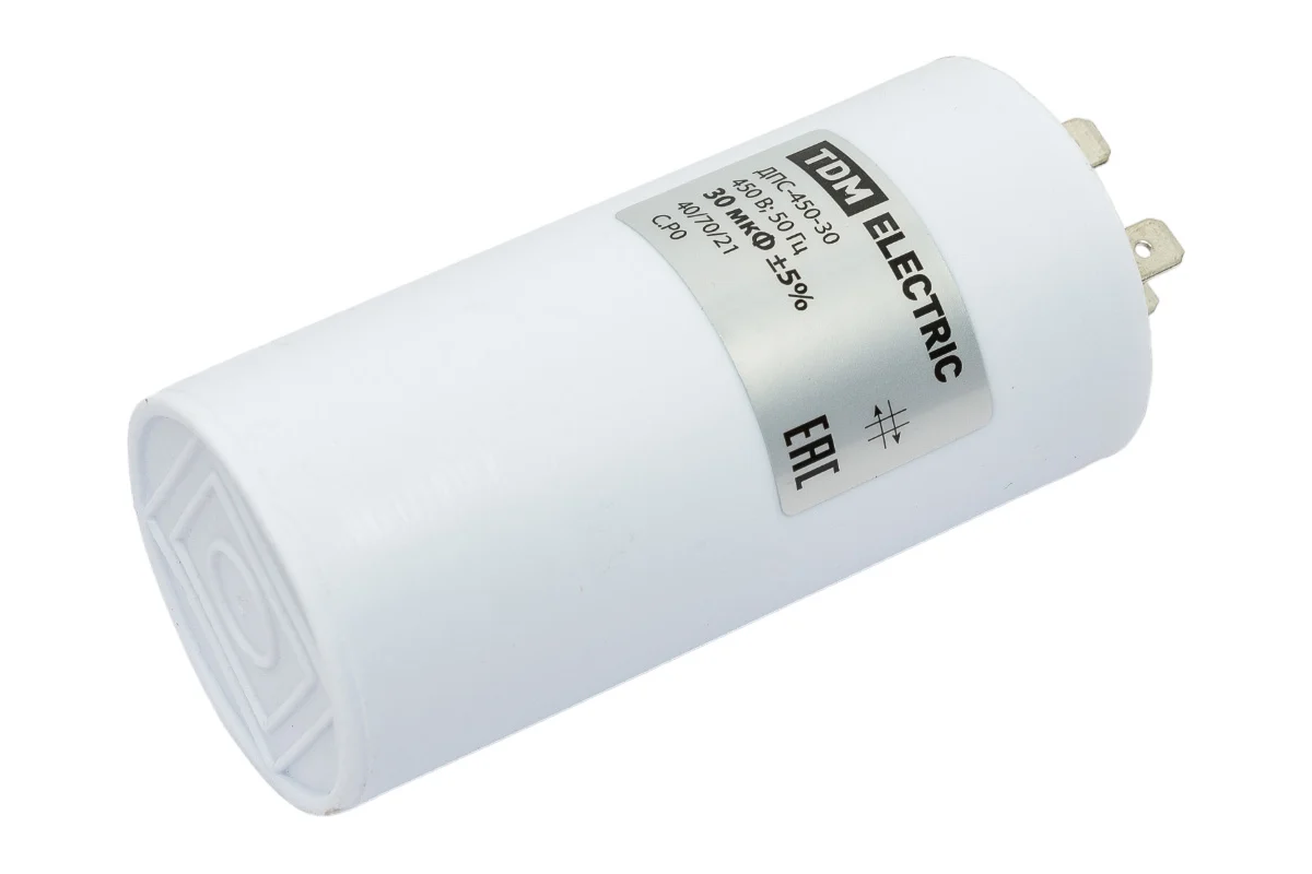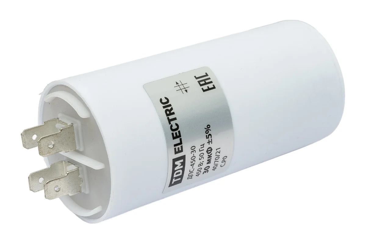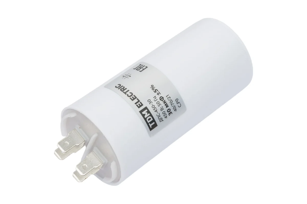 Конденсатор для электродвигателей; Номинальное напряжение: 450 В; Номинальная емкость: 30 мкФ; Плоский разъем.