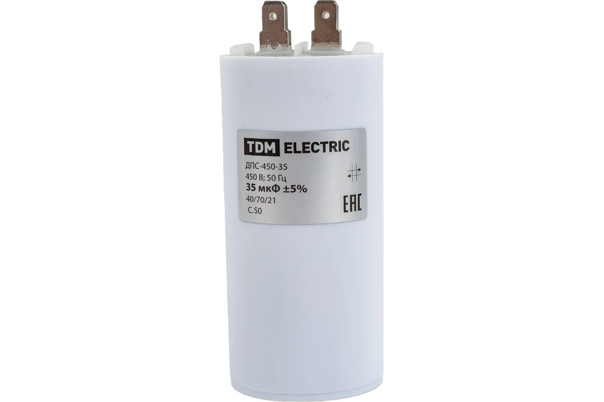 Конденсатор для электродвигателей; Номинальное напряжение: 450 В; Номинальная емкость: 35 мкФ; Плоский разъем.