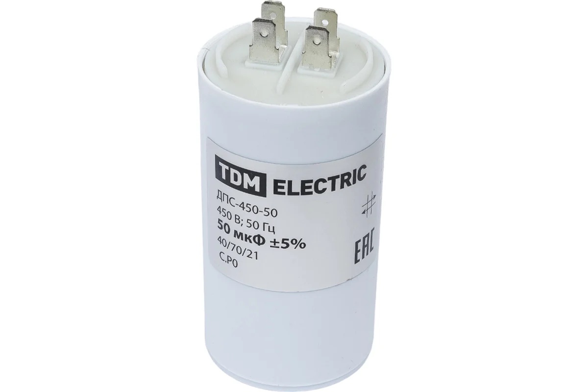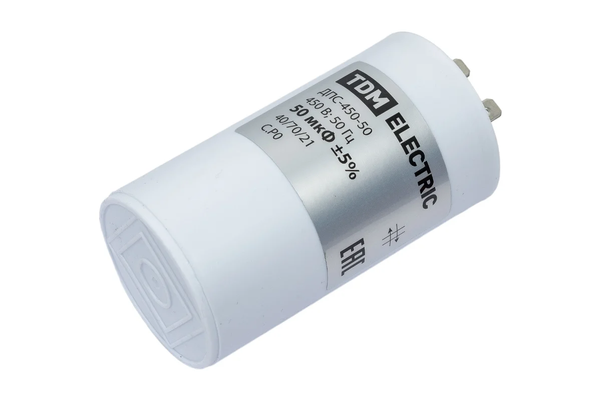 Конденсатор для электродвигателей; Номинальное напряжение: 450 В; Номинальная емкость: 50 мкФ; Плоский разъем.