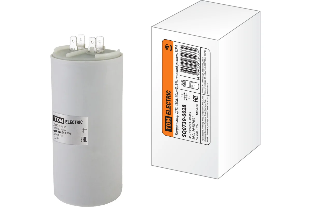 Конденсатор для электродвигателей; Номинальное напряжение: 450 В; Номинальная емкость: 60 мкФ; Плоский разъем.