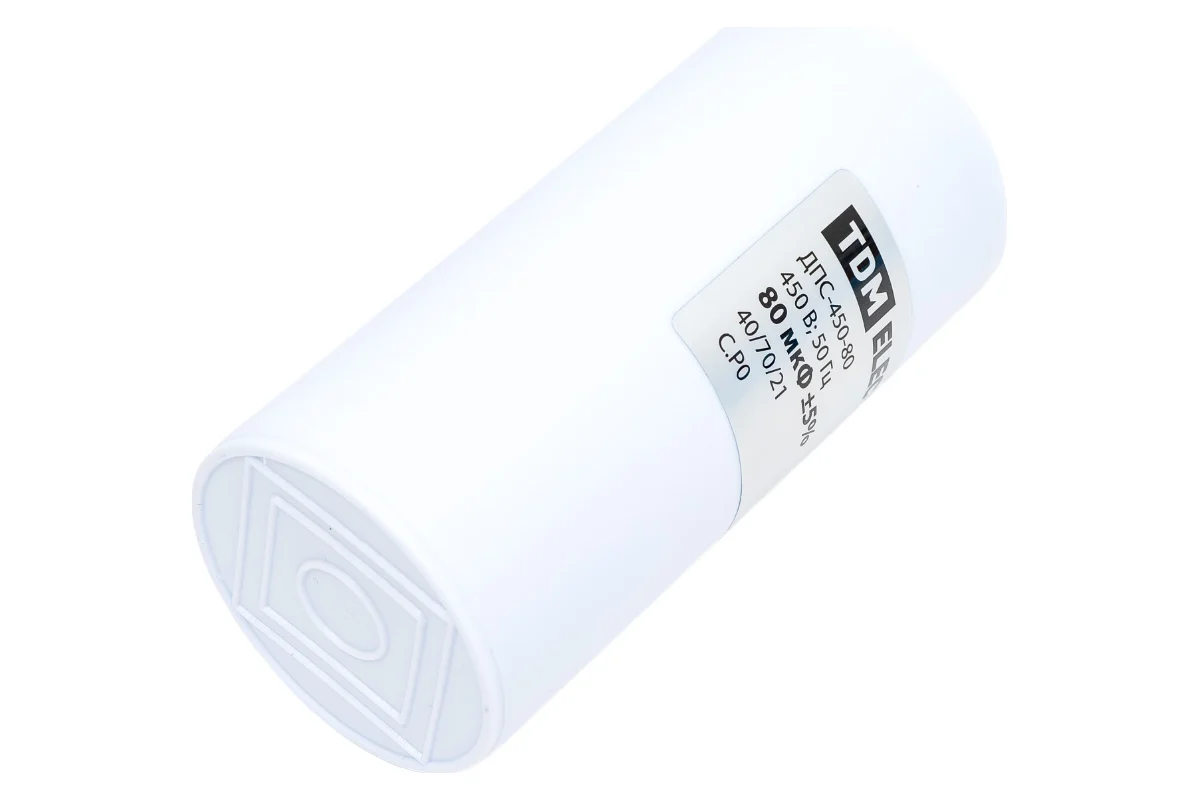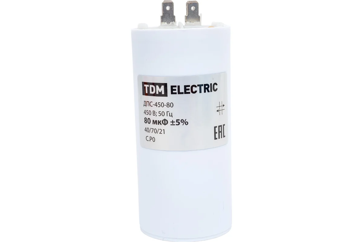 Конденсатор для электродвигателей; Номинальное напряжение: 450 В; Номинальная емкость: 80 мкФ; Плоский разъем.