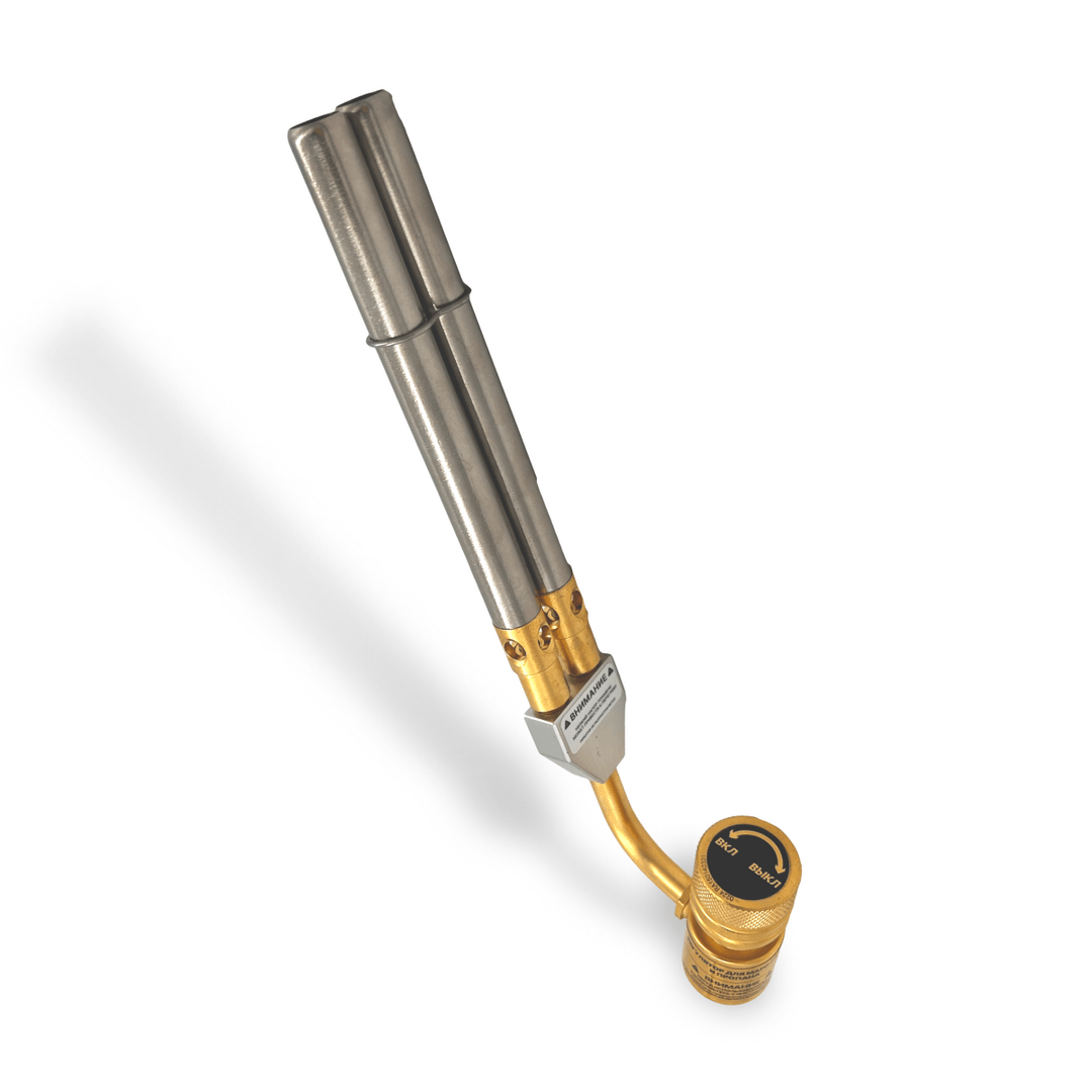 Горелка для MAPP газа BAVIS-26D с двумя соплами, латунным регулятором пламени, встроенным редуктором давления, функцией антивспышки. Тип пламени: Вихревое.