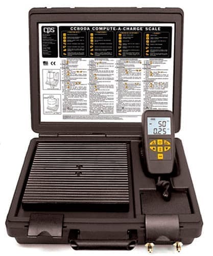 Электронные весы CPS CC800А - точный, прочный инструмент для взвешивания больших весов (100 кг). Данные весы позволяют заправлять как хладагент высокого давления R410А, так и 22 фреон и другие его разновидности. Кроме самой платформы для взвешивания, в состав весов CPS CC800А входит ручной блок управления с 7-ю кнопками с дисплеем для считывания информации. Гибкий шнур соединяет блок управления и платформу. В корпус вмонтировал 9В соленоидный клапан постоянного тока с резьбой 1/4 SAE впускными и выпускными портами.