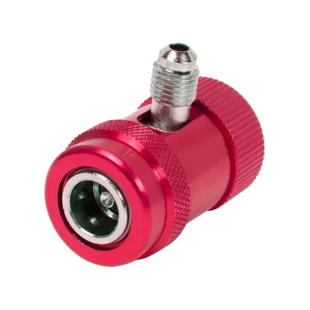 Быстросъемная муфта высокого давления FavorCool QX-HA для подсоединения к порту заправки автомобильных кондиционеров, работающих на хладагенте R134A. Быстросъёмная муфта с вентилем FavorCool QX-HA предназначена для подсоединения к порту высокого давления автомобильного кондиционера без открытия доступа к системе циркуляции хладагента. Поворот вентиля по часовой стрелке приводит в действие механизм опускания штока-депрессора, который нажимает на золотник и, тем самым, открывает доступ к системе циркуляции хладагента.