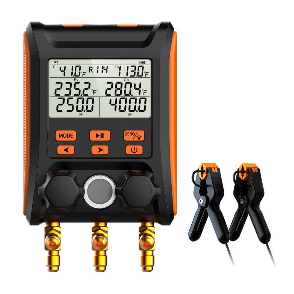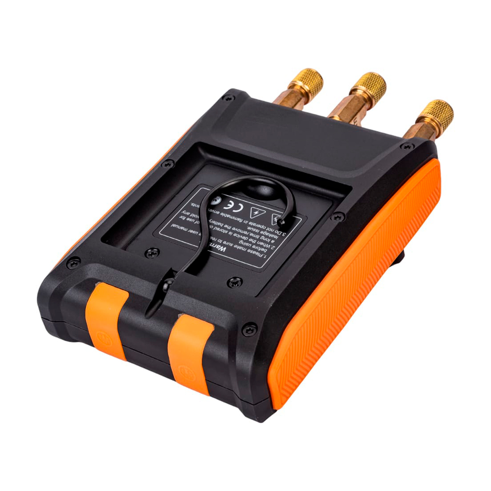 Цифровой 2-х вентильный манометрический коллектор. Поддерживает 88 типов хладагентов, которые хранятся в памяти устройства. В комплекте 2 датчика WTP-1, 3 шланга 0.9м до 55bar, 2 адаптера, кейс.