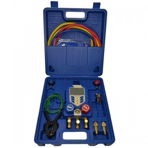 Манометрический коллектор электронный в кейсе VDG-1 состоит из высокоточного манометра высокого и низкого давления, а также 2-х запорных вентилей и используется для контроля давления в холодильных установках, а также для заправки различных холодильных систем и систем кондиционирования.