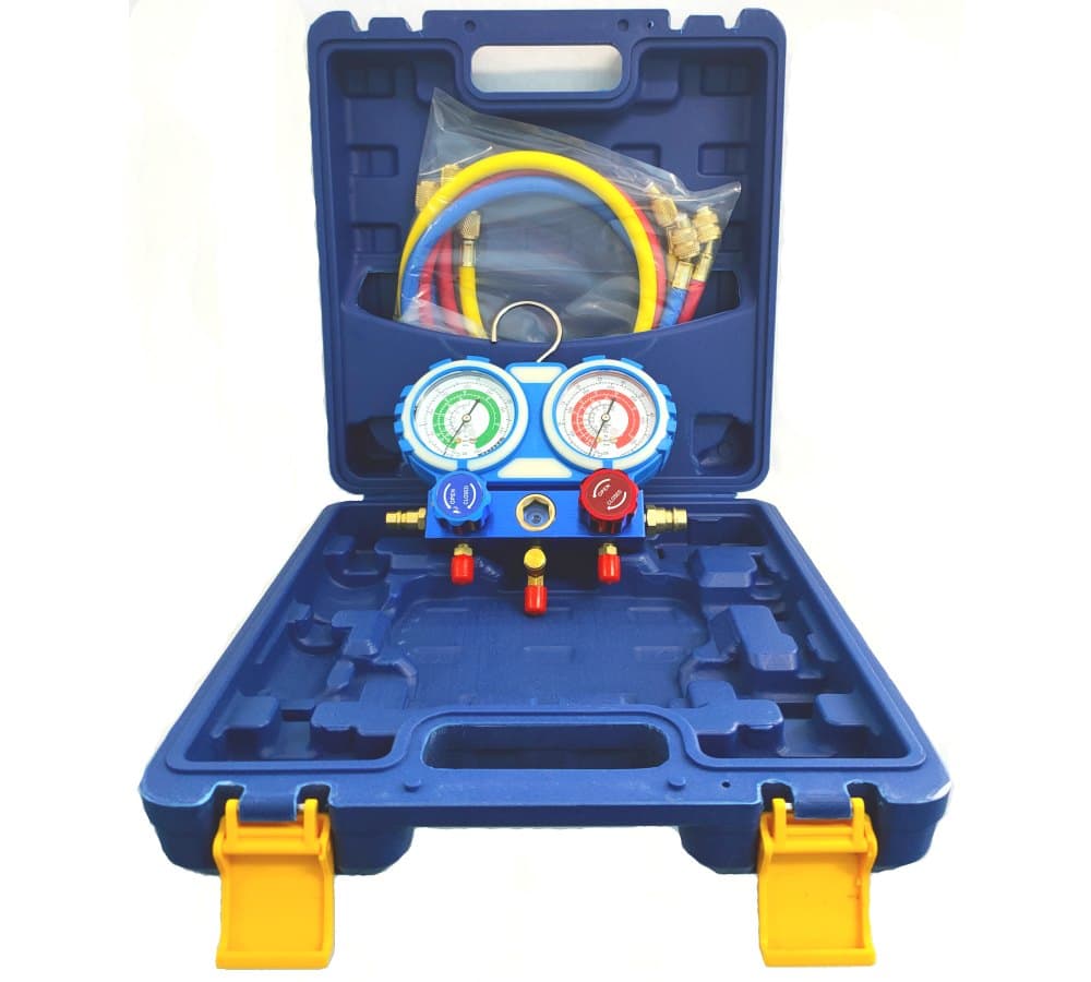 Поставляется в кейсе в комплекте с заправочными шлангами длиной 90 см 1/4" - 5/16"(R410A) до 800 PSI / 55 Bar.