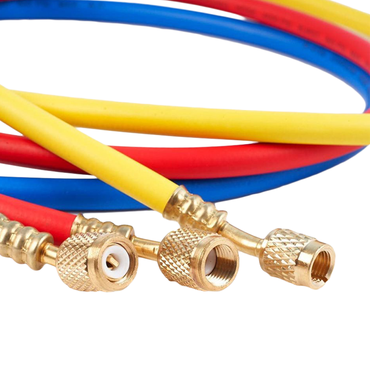 Манометрический 2 вентильный коллектор DSZH WK-536G-R410A для работы с фреонами R22/134/404/407/410. Поставляется в комплекте с тремя заправочными шлангами до 55 Bar(800Psi), длиной 90 см, присоединительные размеры 5/16" SAE (тефлоновые манжеты).