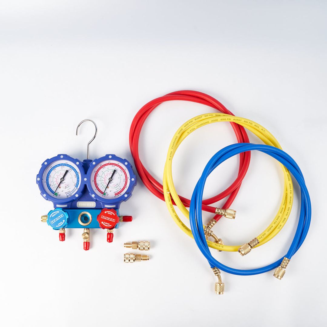 Двухвентильный манометрический коллектор DSZH WK-P6002B с диаметром манометров 80 мм для работы с фреоном R22/404/407/410. 3 заправочных шланга с гайками SAE 1/4" длиной 1,5 метра, на рабочее давление 800 PSI (до 55 Bar).