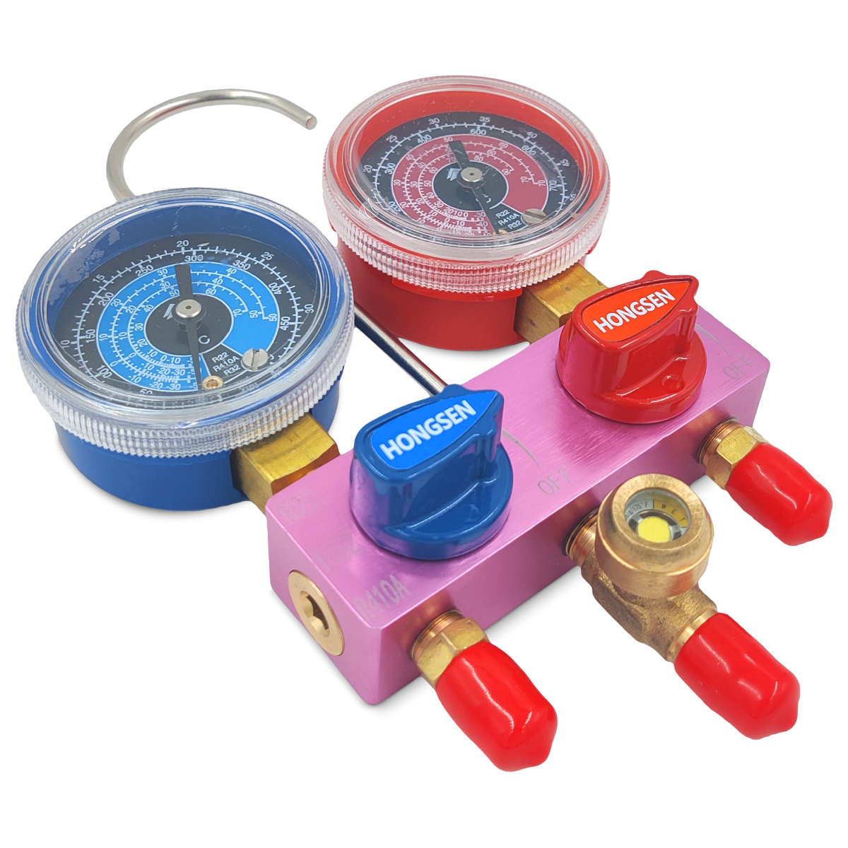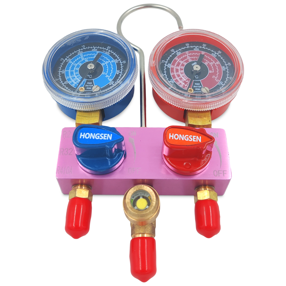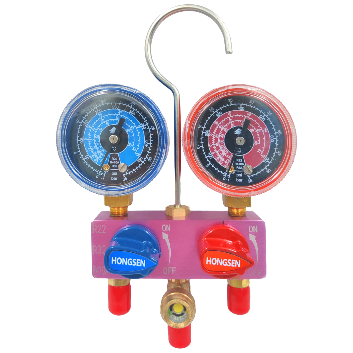Манометрический коллектор HONGSEN HS-M02-410-A 2х-вентильный - применяется для измерения низкого давления в холодильных системах и температуры трубопровода, работающих на хладоне.