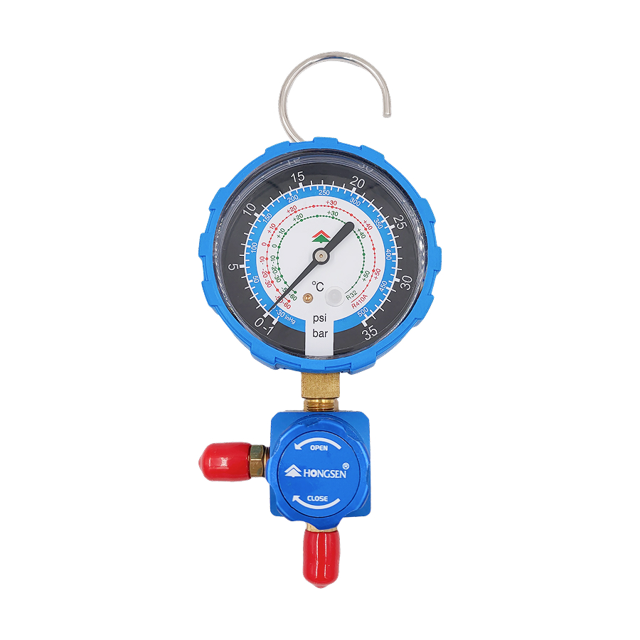 Манометрический 1-вентильный коллектор низкого давления HONGSEN HS-468AL - инструмент для определения давления в холодильном контуре. Хладагенты: R32, R410. Без шлангов.