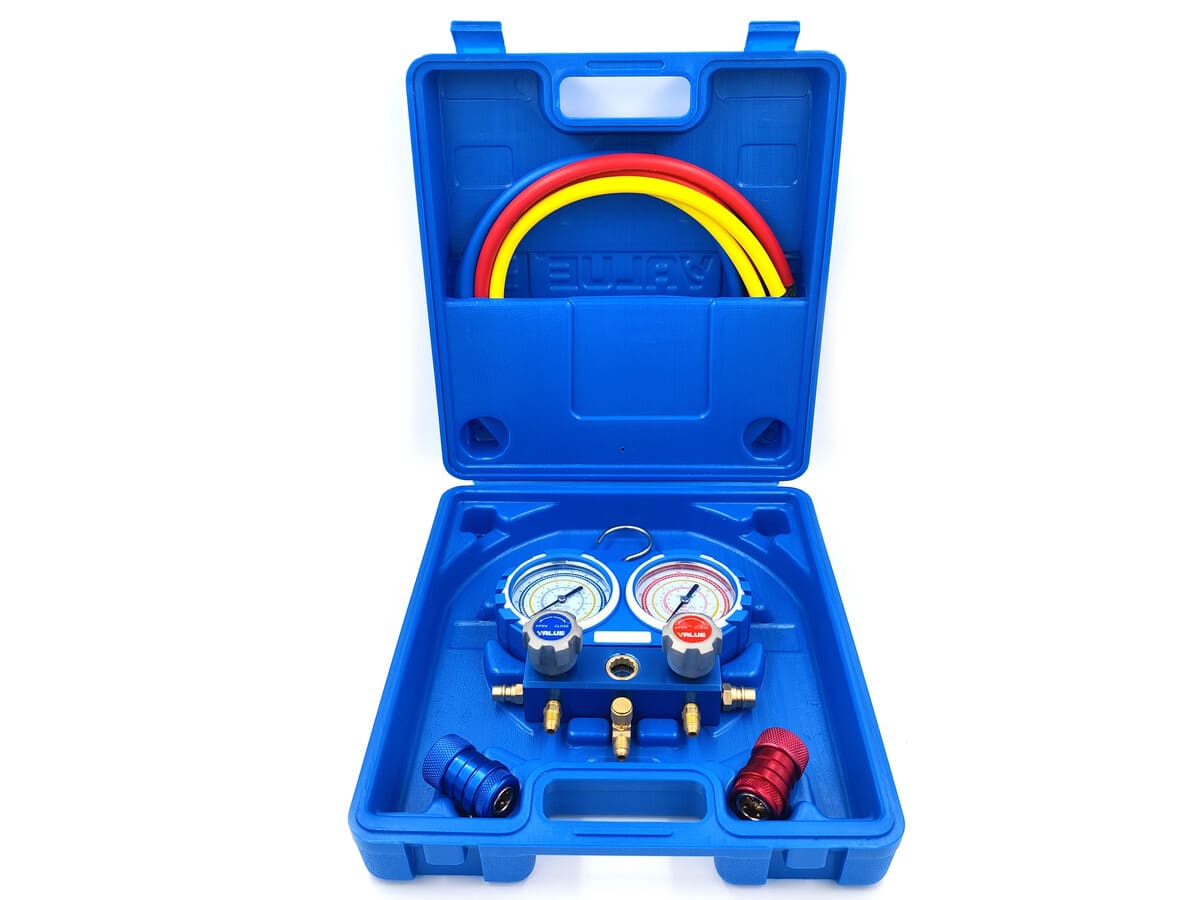 Манометрический 2-х вентильный коллектор (R134a) в пластиковом кейсе, 3 шланга 120 см 1/4" SAE, вентили быстросъемные, манометры 80 мм.