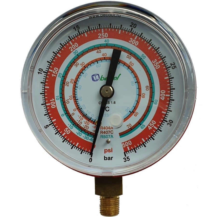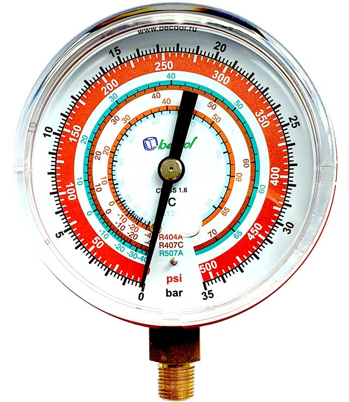 На шкалу манометра нанесены температурные шкалы R134a, R404A, R407C, 507A, имеется юстировочный винт измерительного механизма.