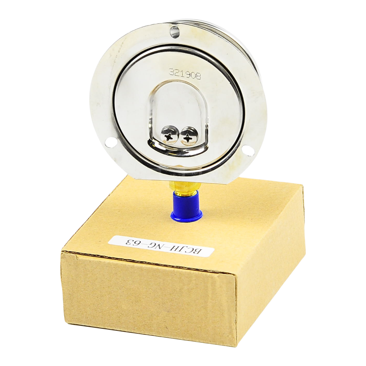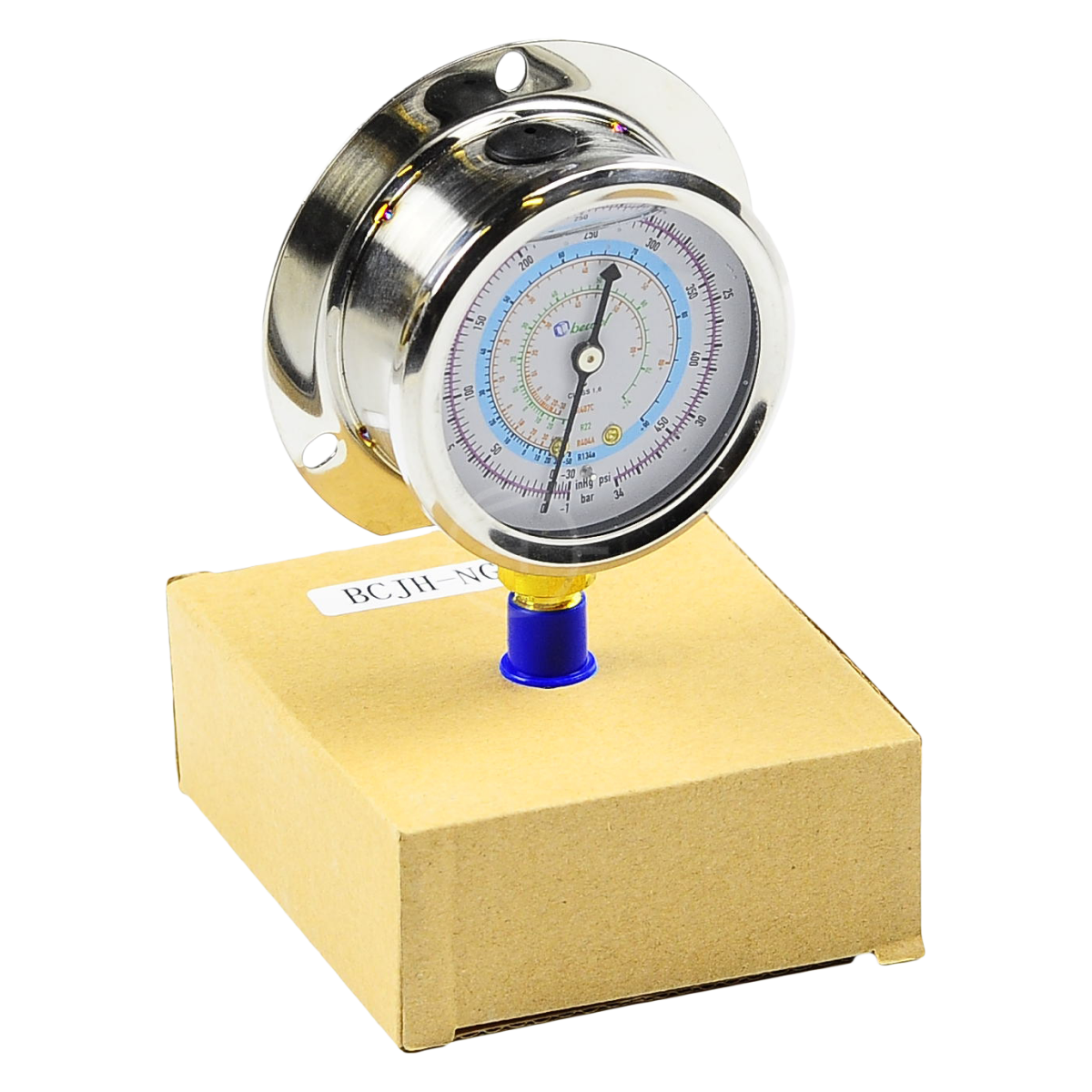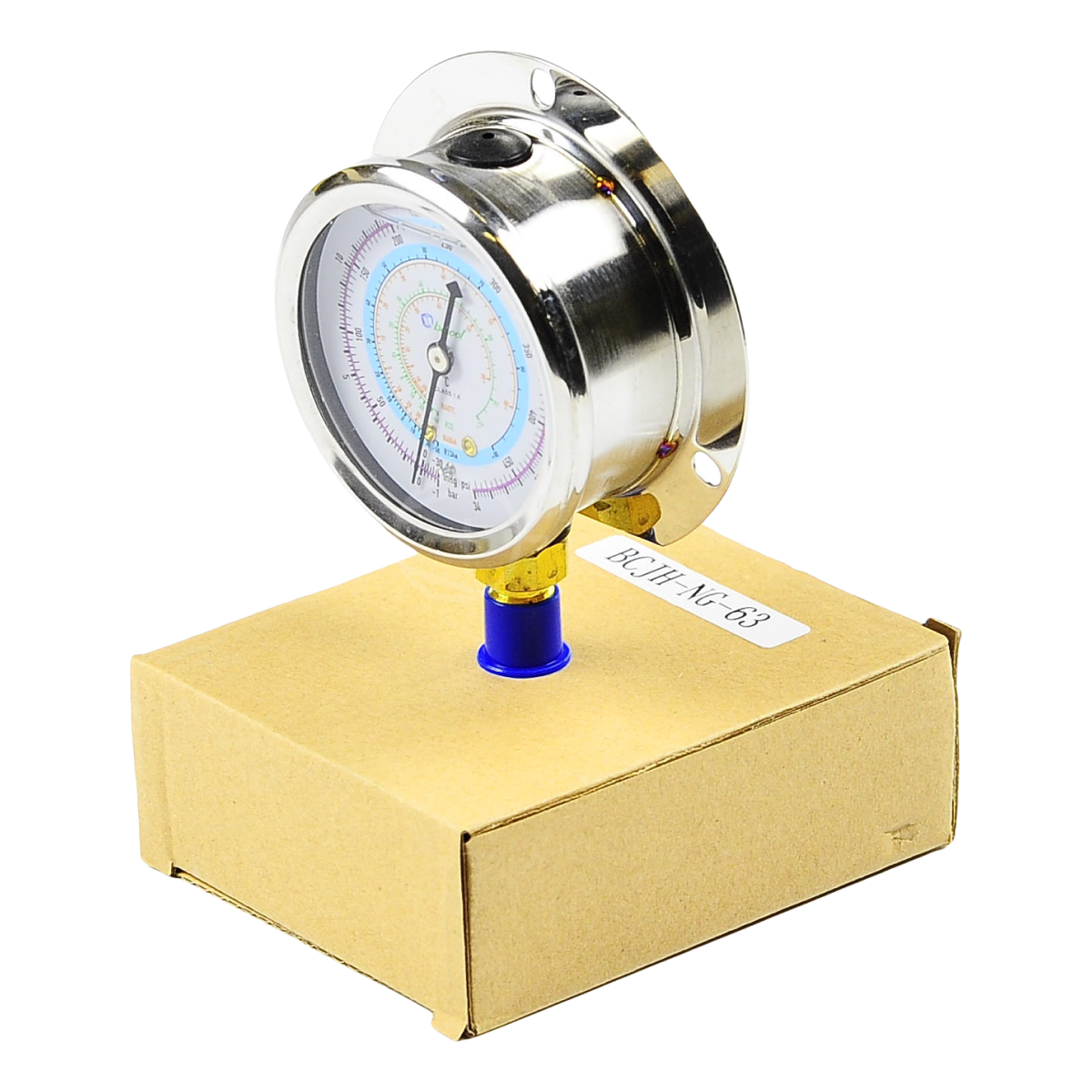 Манометр с глицерином Becool BCJH-NG-63 предназначен для измерения давления в пределах от -1 до 34 Бар. Манометр с глицерином Becool BCJH-NG-63 - это прибор с механизмом измерения давления в виде трубчатой пружины, диаметр шкалы 63 мм, присоединительный латунный штуцер имеет резьбу М1/4" SAE. Герметичный корпус манометра Becool BCJH-NG-63 изготовлен из нержавеющей стали, имеется "юбка" с тремя крепёжными отверстиями, для демпфирования колебаний измерительного механизма в корпус залит глицерин. На шкалу манометра нанесены температурные шкалы R22, R134a, R404A, R407C.