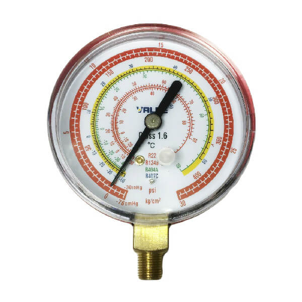 Манометр VALUE BBH предназначен для измерения давления в пределах от 0 Бар до 30 Бар.Манометр BBH - это прибор с механизмом измерения давления в виде трубчатой пружины, диаметр шкалы 68 мм.Корпус манометра изготовлен из окрашенной методом порошковой окраски в красный цвет стали.На шкалу манометра нанесены температурные шкалы R22, R134A, R404A, R407С, имеется юстировочный винт измерительного механизма.