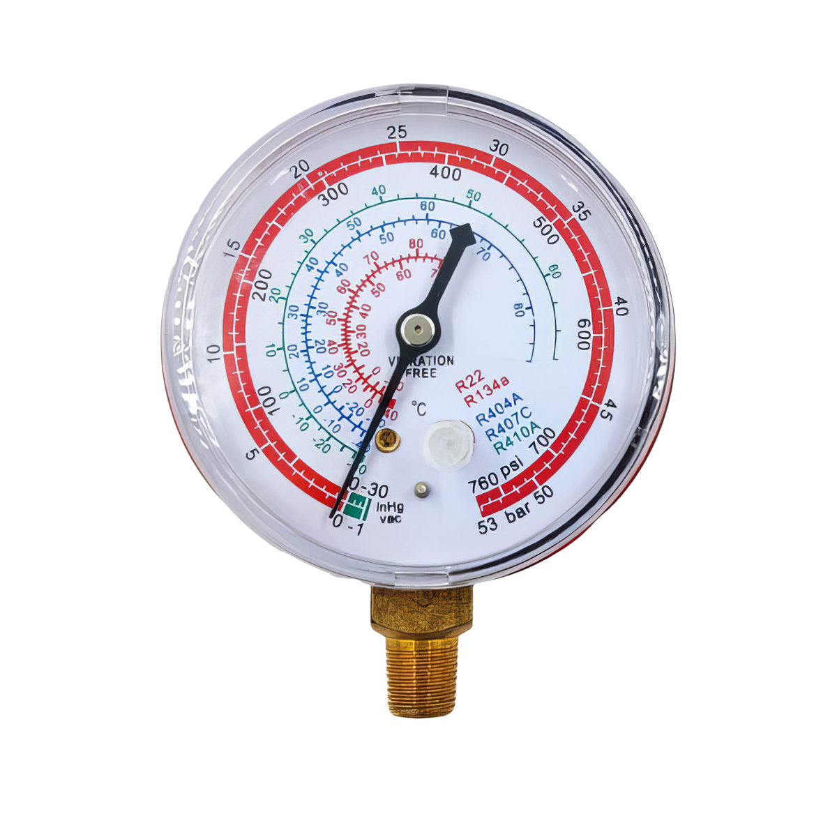Корпус мановакуумметра изготовлен из окрашенной методом порошковой окраски в красный цвет стали. На шкалу нанесены температурные шкалы R22, R134A, R404А, R407, R410A.