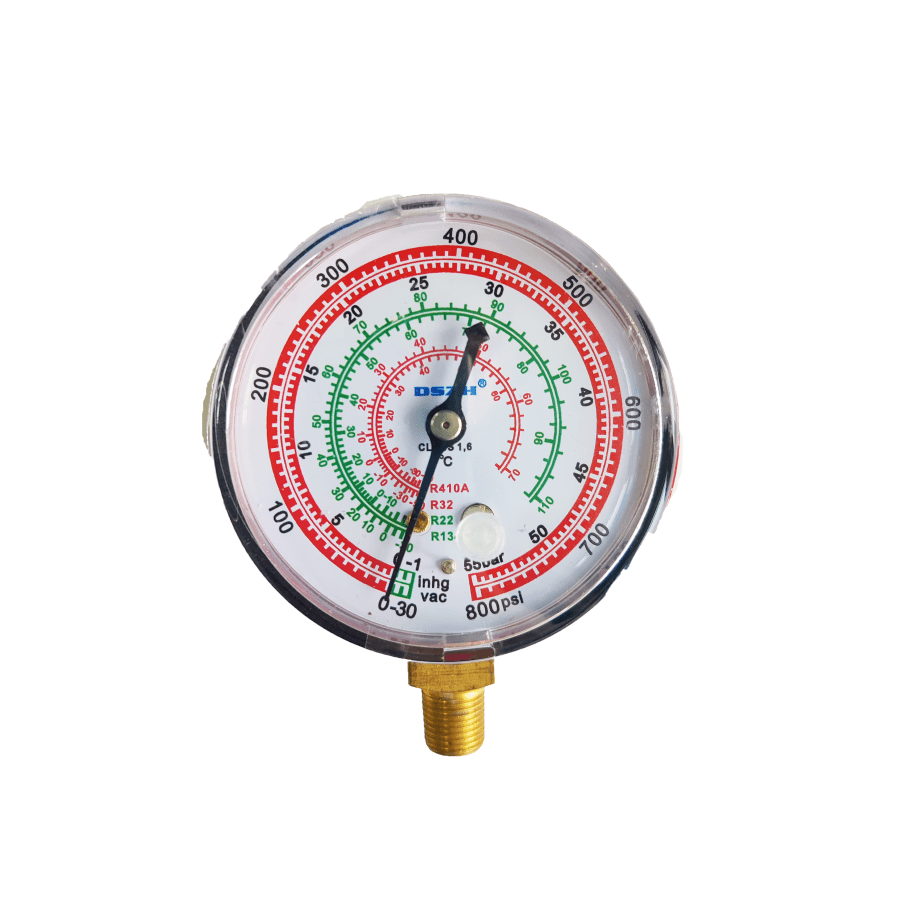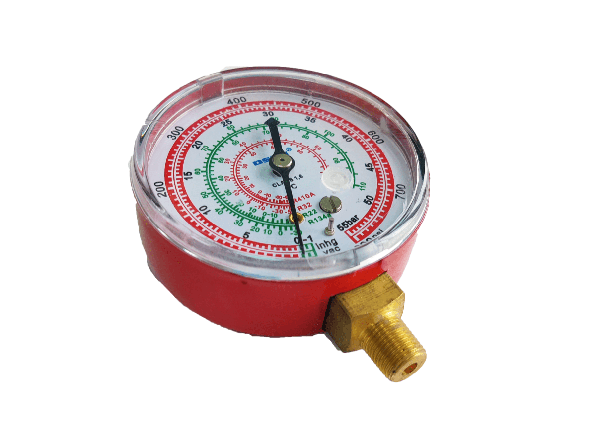 Корпус мановакуумметра изготовлен из окрашенной методом порошковой окраски в красный цвет стали. На шкалу нанесены температурные шкалы R22, R134A, R32, R410A.