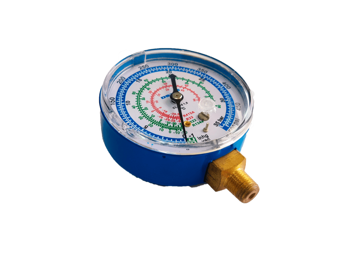 Корпус мановакуумметра изготовлен из окрашенной методом порошковой окраски в синий цвет стали. На шкалу нанесены температурные шкалы R22, R134A, R32, R410A.