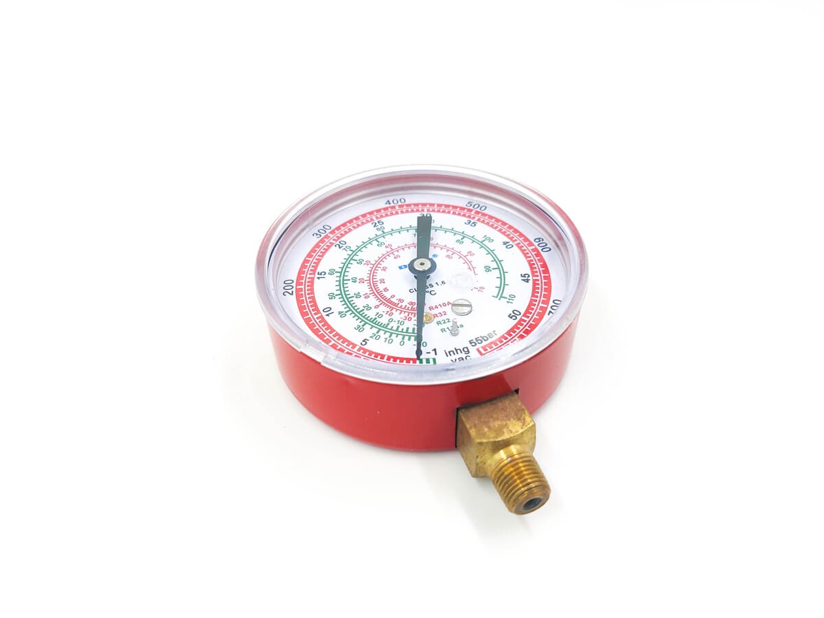 Корпус мановакуумметра изготовлен из окрашенной методом порошковой окраски в красный цвет стали. На шкалу нанесены температурные шкалы R22, R32, R134, R410A.