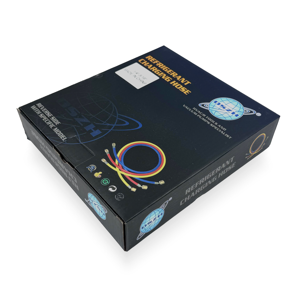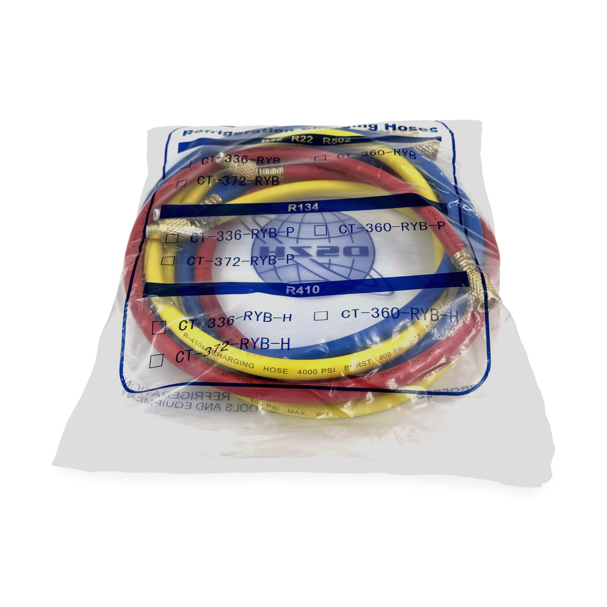 Комплект, состоящий из 3-х заправочных шлангов 1/4 SAE x 5/16 SAE под R-410A по 0.9 м для заправки и вакуумирования кондиционеров. Давление до 55 Bar.