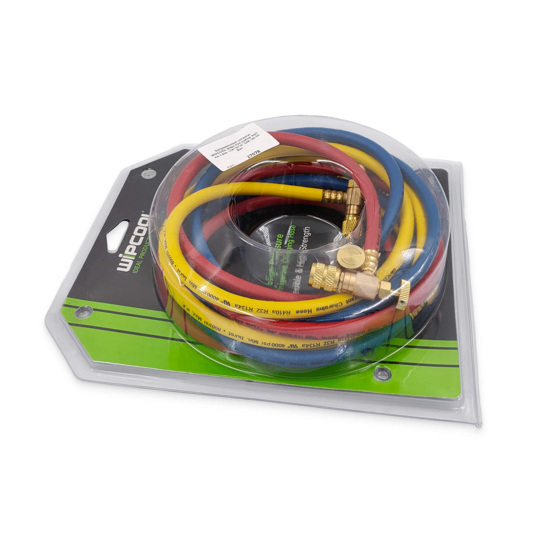Комплект состоящий из 3-х заправочных шлангов с сервисным вентилем по 1.8 м для заправки и вакуумирования кондиционеров. Применяются для соединения контура с вакуумными насосами и станциями рекуперации, манометрическими станциями, баллонами с хладагентами и другими приборами.