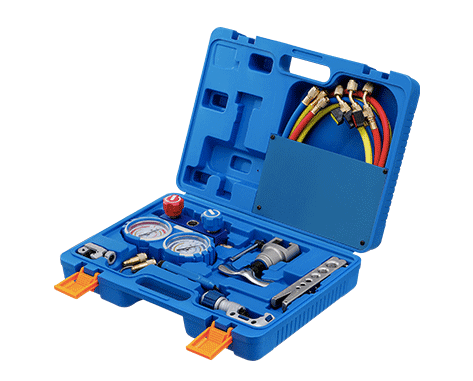 Универсальный набор инструментов в кейсе: коллектор для R22,R134A,R407C,R410A; шланги с вентилями; 2 переходника; вальцовка; 2 трубореза; риммер.