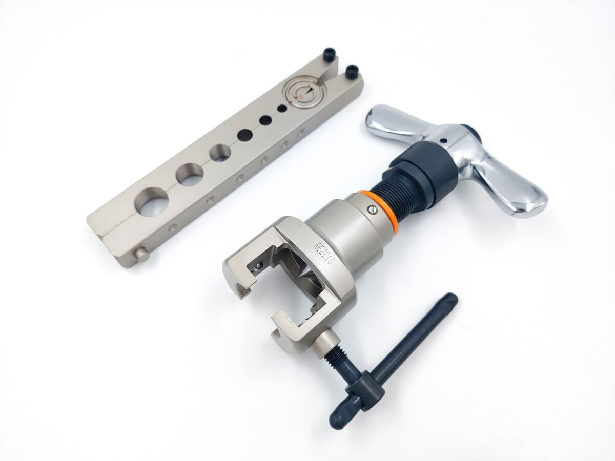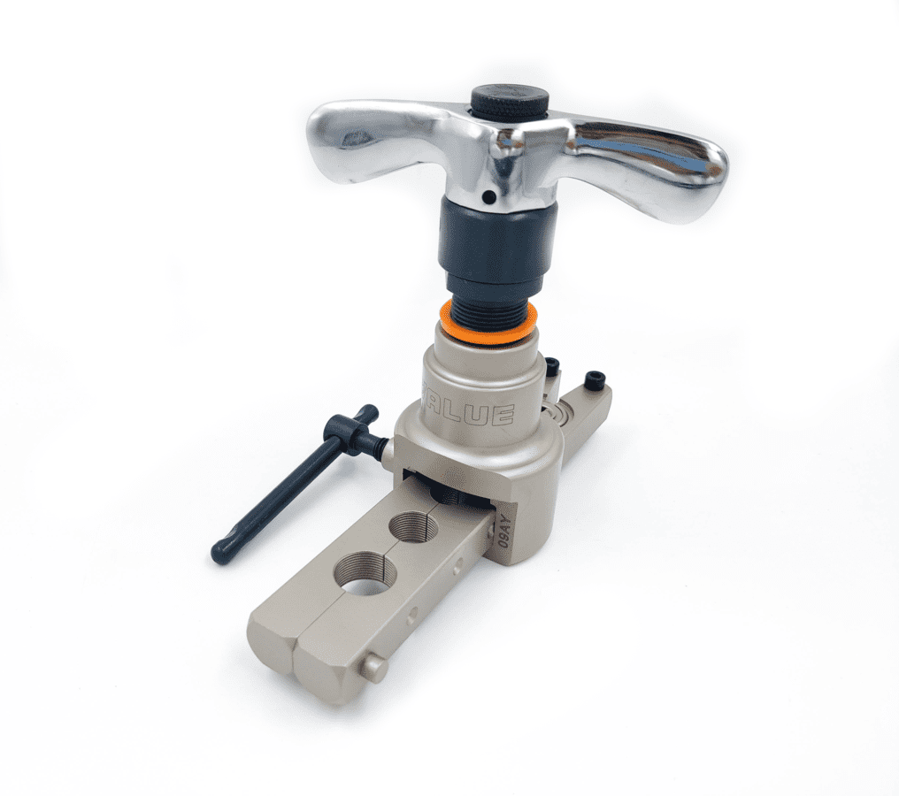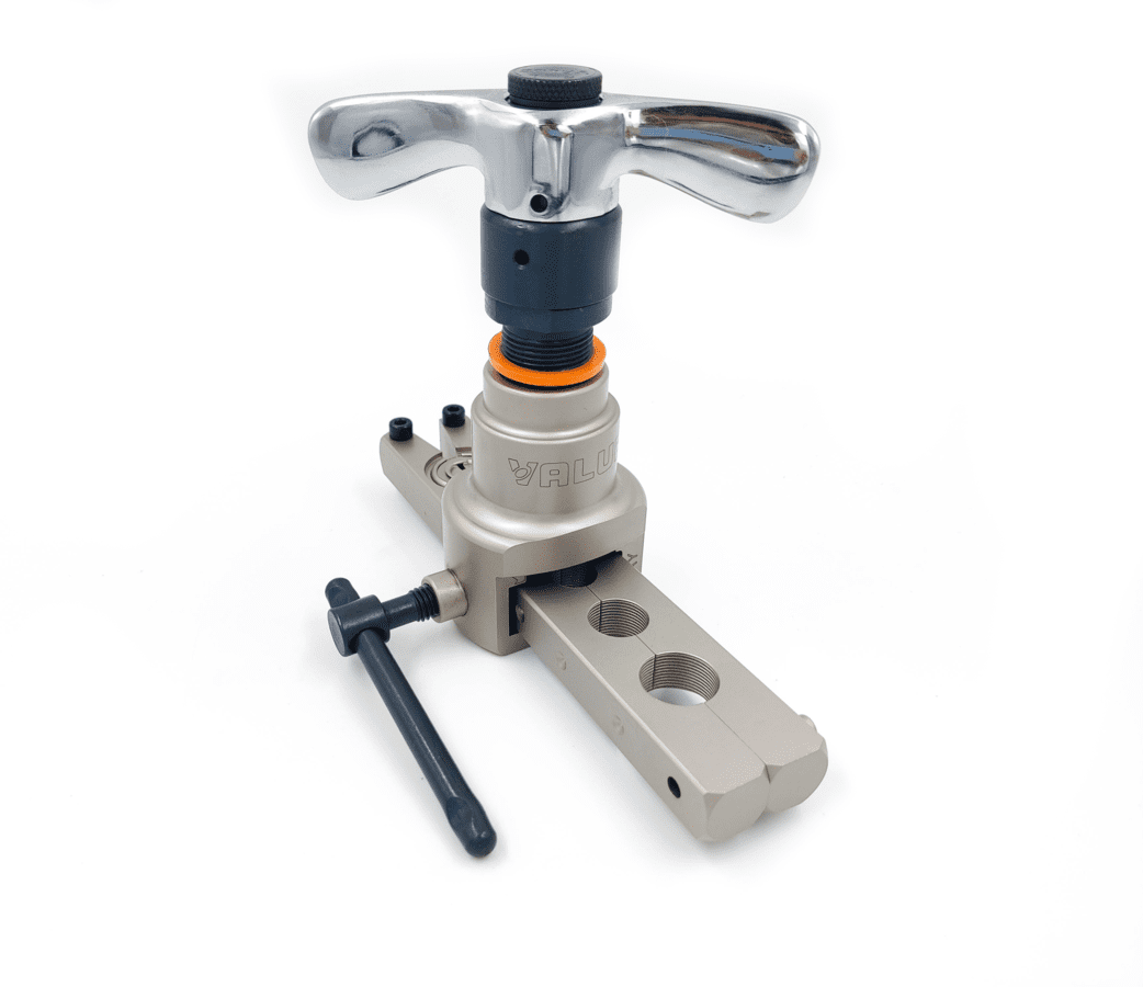 Набор для вальцевания и резки дюймовых медных и алюминиевых труб диаметром: (1/4", 5/16", 3/8", 1/2", 5/8", 3/4"). Поставляется в пластиковом кейсе с труборезом VTC-28B и плашкой 1/4" - 3/4".