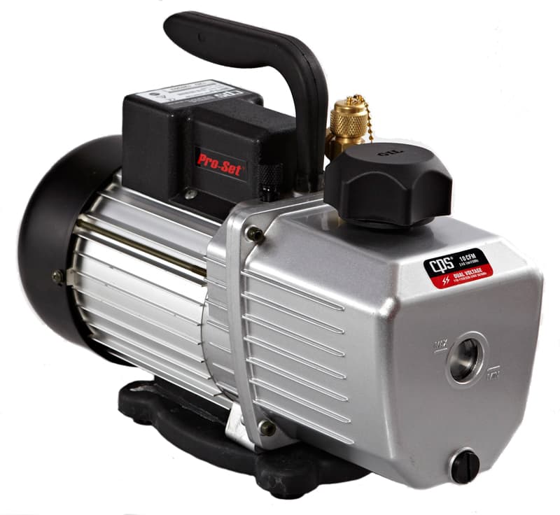 Вакуумный насос CPS VP10D отличается высокой производительностью, надежностью и удобством в использовании. Насос предназначен для вакуумирования магистралей систем охлаждения и кондиционирования. Универсальность насосу CPS VP10D придает штуцер для подсоединения шлангов от обслуживаемой магистрали: он имеет три резьбы — 1/4", 3/8" и 1/2" SAE.