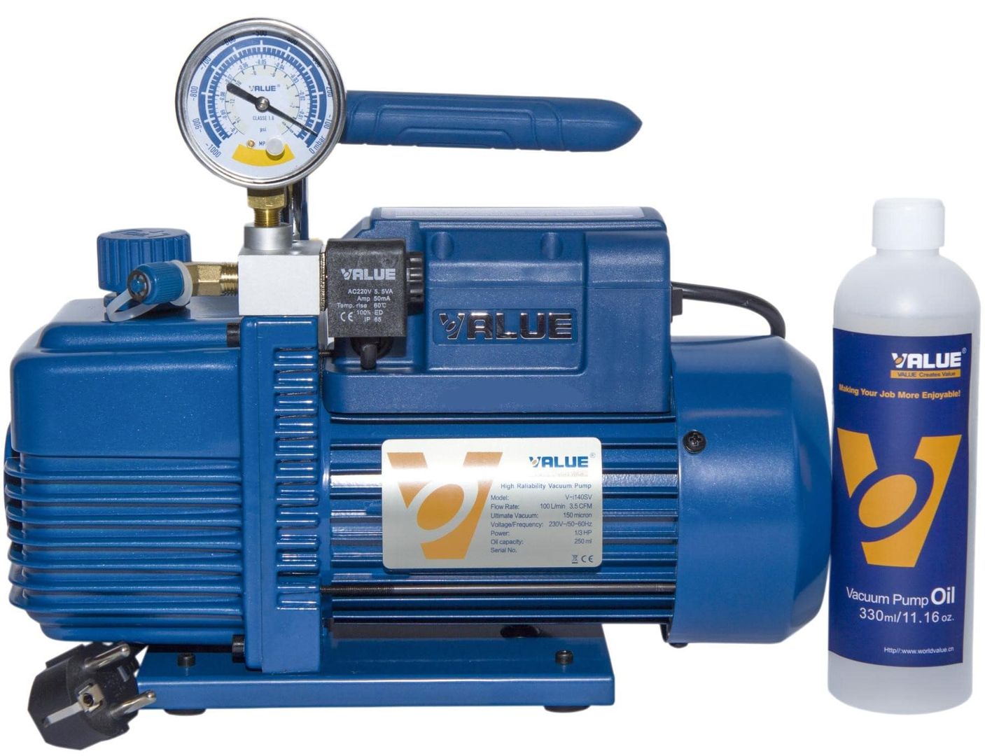 Value VI-140SV - 1 ступенчатый вакуумный насос, производительностью 100 л/мин с вакуумметром и отсечным клапаном. Отсечной клапан предотвращает попадание воздуха в систему после остановки вакуумного насоса. Определить систему на герметичность можно считав показания на вакууметре, и по истечению срока проверки системы (обычно это занимает 3-5 минут) сравнить показания с текущими. На насосе установлен отсечной соленоидный клапан, это позволяет не использовать запорный шаровой вентиль на шланге для вакуумирования. Отсечной соленоидный вентиль автоматически срабатывает на вакуумном насосе при его отключении.