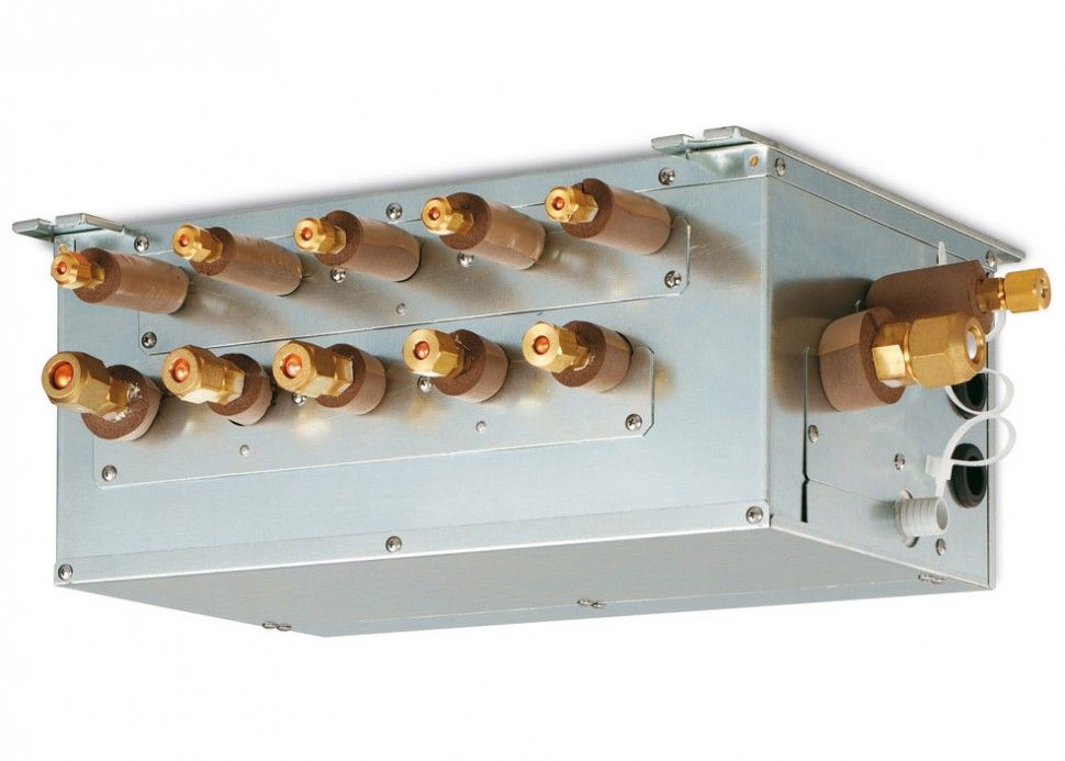 Электронная плата управления содержит датчики и контролирует электронные расширительные клапаны системы "мастер-вентиль" для пропуска хладагента как во внутренний, так и в наружный блок. Сам распределитель установлен снаружи, что делает удобным и быстрым его обслуживание.