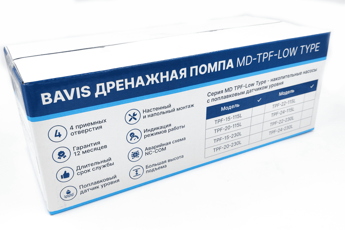 Помпа дренажная BAVIS Tank Low MD-TPF-15-230L накопительная для отвода конденсата от нескольких единиц оборудования. Напольный или настенный вариант монтажа. 4 приемных отверстия. Объем: 1.2л. Уровень шума 35 дБ(А). Производительность: 250 л/ч.