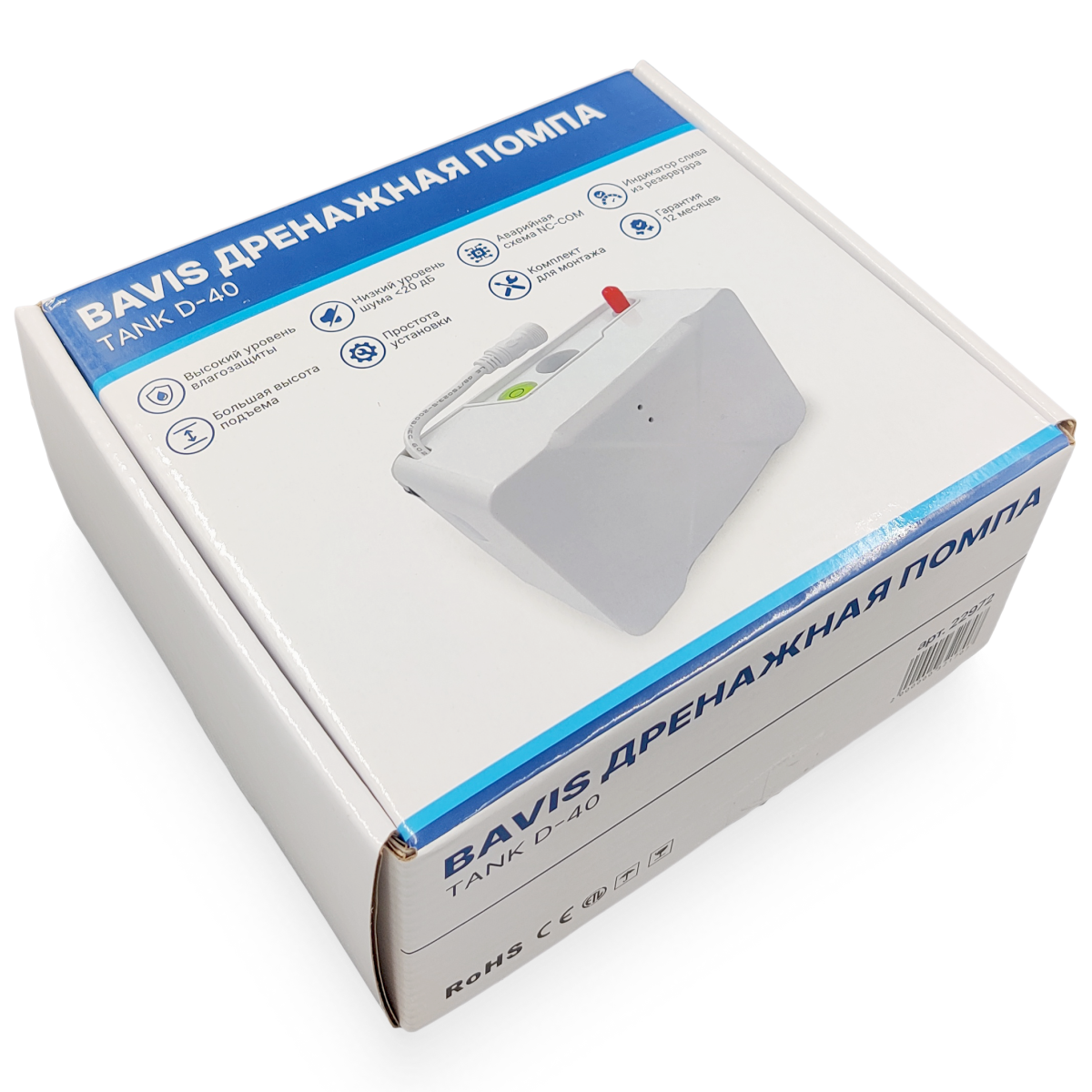 Помпа дренажная BAVIS Tank D-40 накопительная представляет собой накопительную емкость вкупе с насосом, помещенные в пластиковый белый корпус. Корпус помпы крепится под внутренним блоком кондиционера и непосредственно подключается к его дренажной системе. Работает от сети 220-240В. Уровень шума 19 дБ(А). Объем 0,3 л. Производительность 40 л/ч.