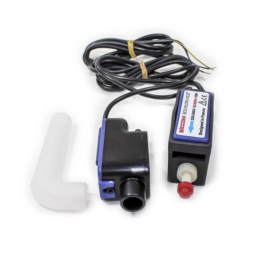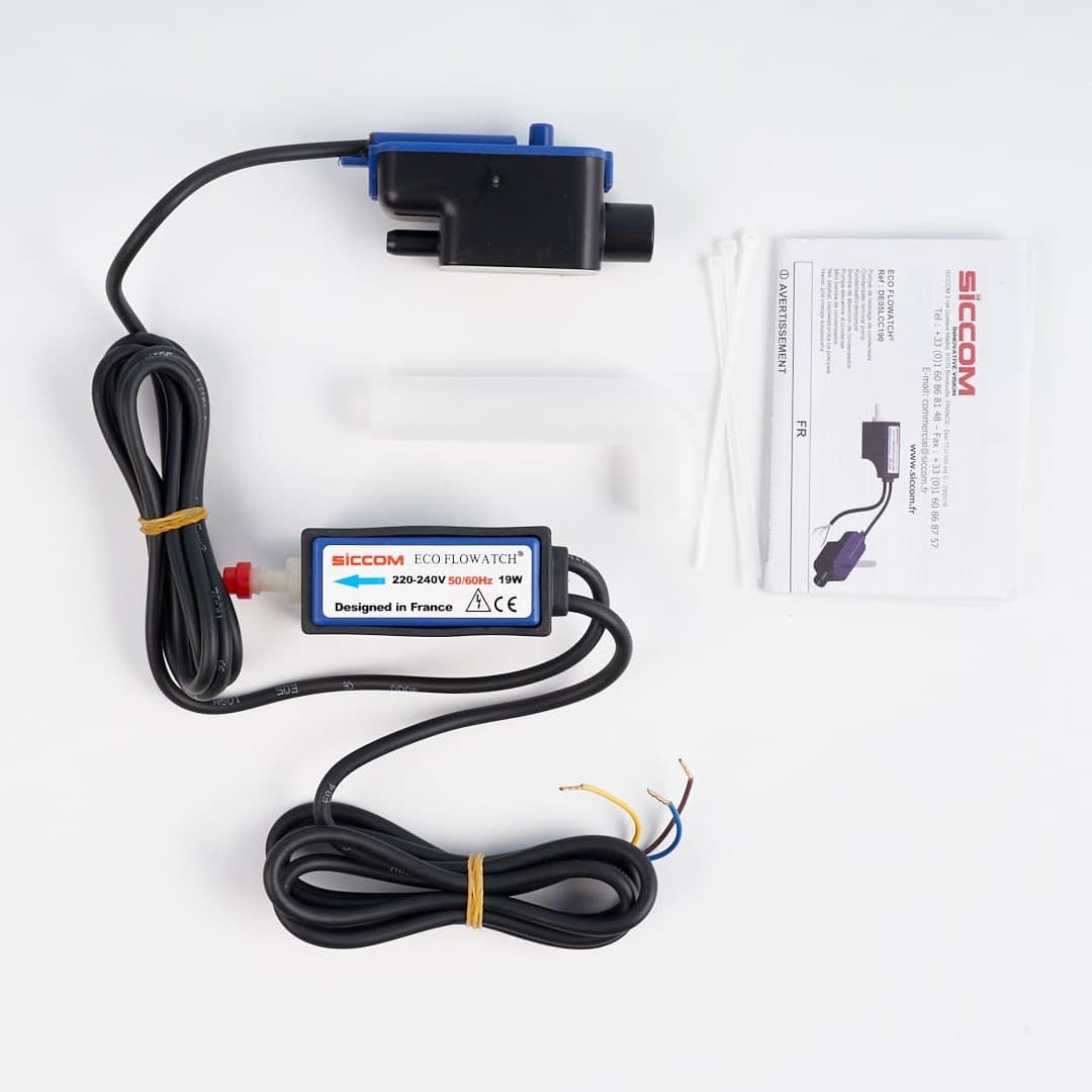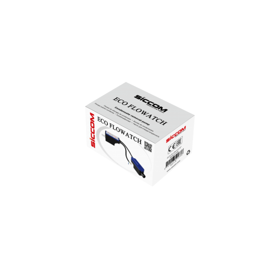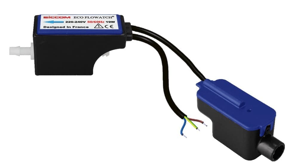 Особенностью помпы Eco Flowatch являются простая конструкция и малые габариты. Корпус насоса выполнен из элластопласта - мягкого материала, препятствующего распространению шумов и вибраций. Датчик имеет вытянутую форму с минимальными поперечными размерами. Внутри корпуса дренажного датчика размещается поплавок и несъемный фильтр. Насос и датчик изначально соединены между собой управляющим кабелем, длинной 1.5 м.