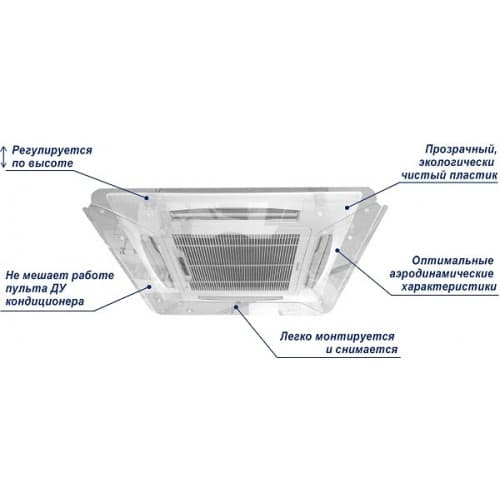 1. Равномерно распределяют холодный воздушный поток в помещении, создавая комфортную температуру. Без защитного экрана человек, находящийся рядом с кондиционером, будет мёрзнуть. Защитный экран для кассетного кондиционера исправит ситуацию.