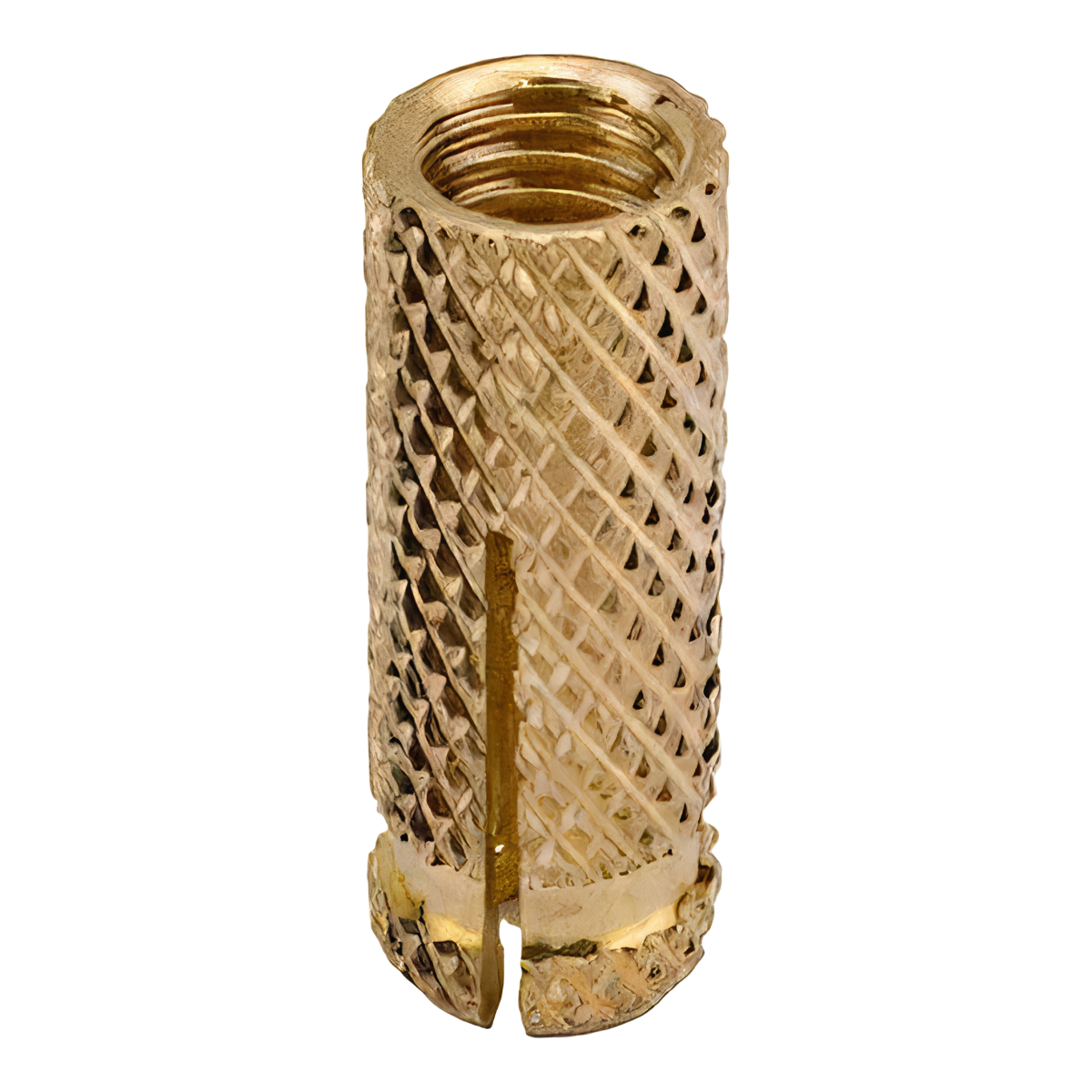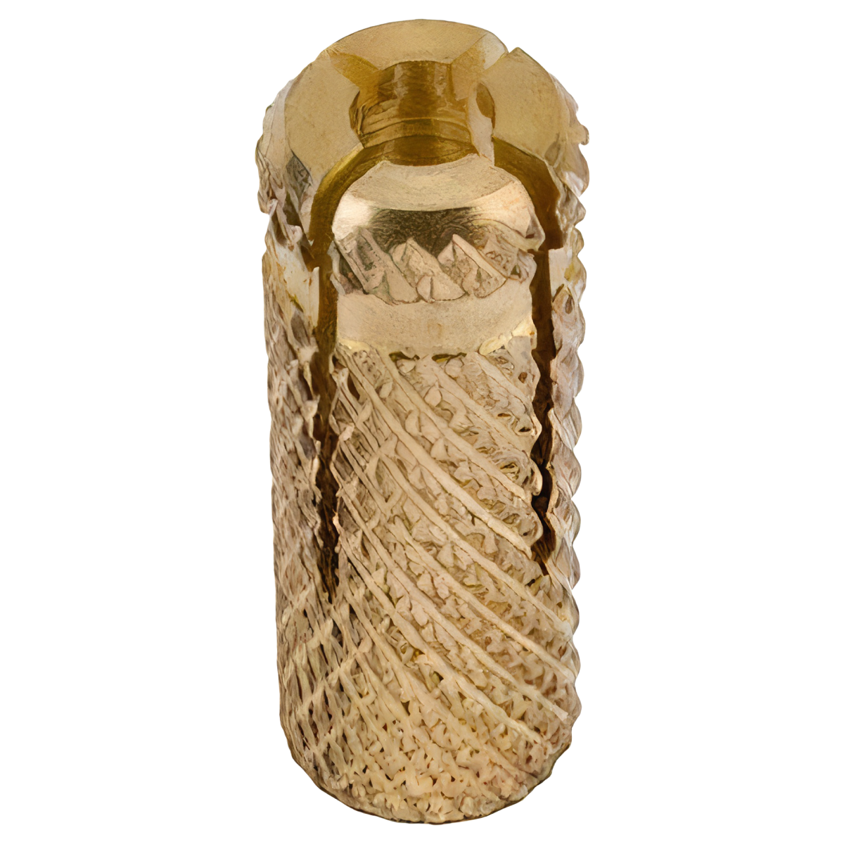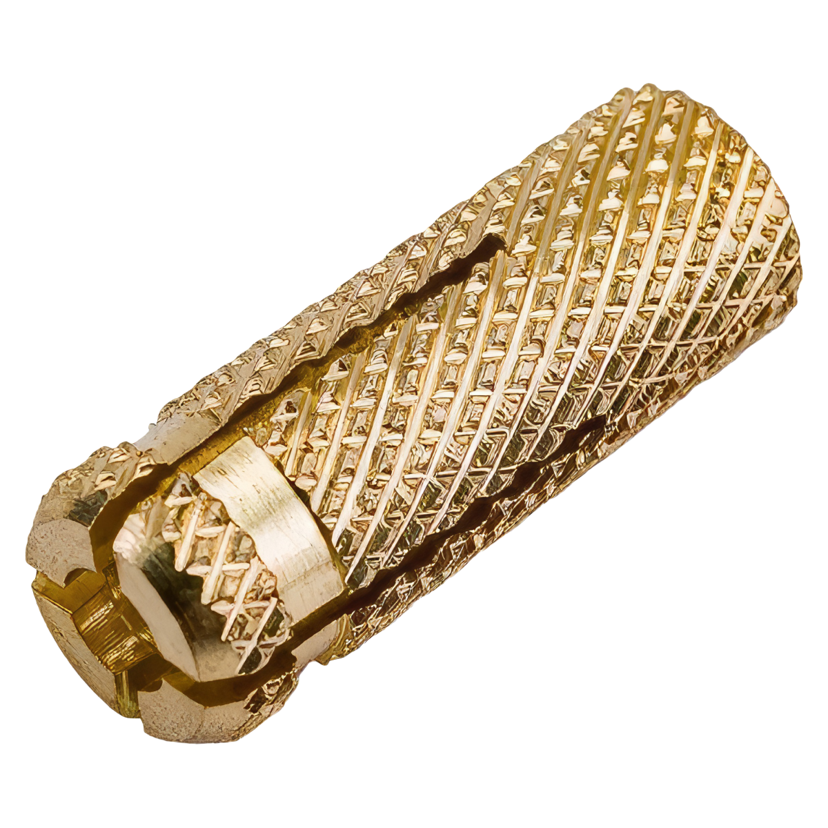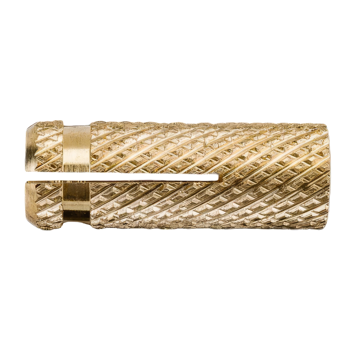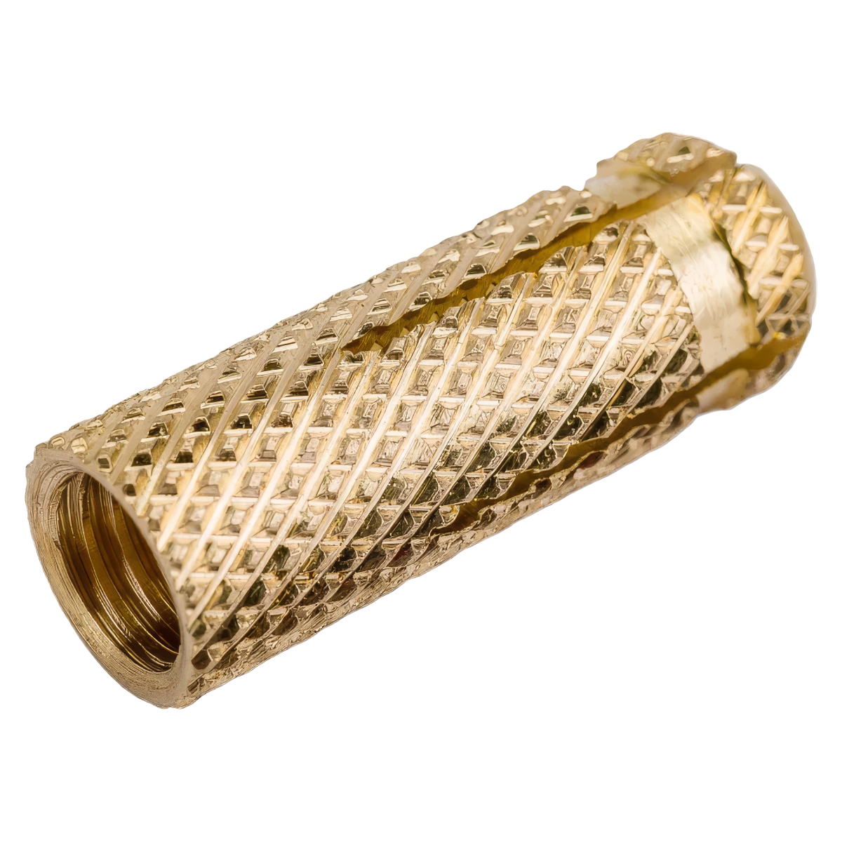 Латунная цанга имеет цилиндрическую форму, а ее внутренняя резьбовая часть – коническую, также в конструкции есть распорная зона, состоящая из четырех сегментов. Внешняя поверхность цанги имеет насечки, которые препятствуют вращению в отверстии.