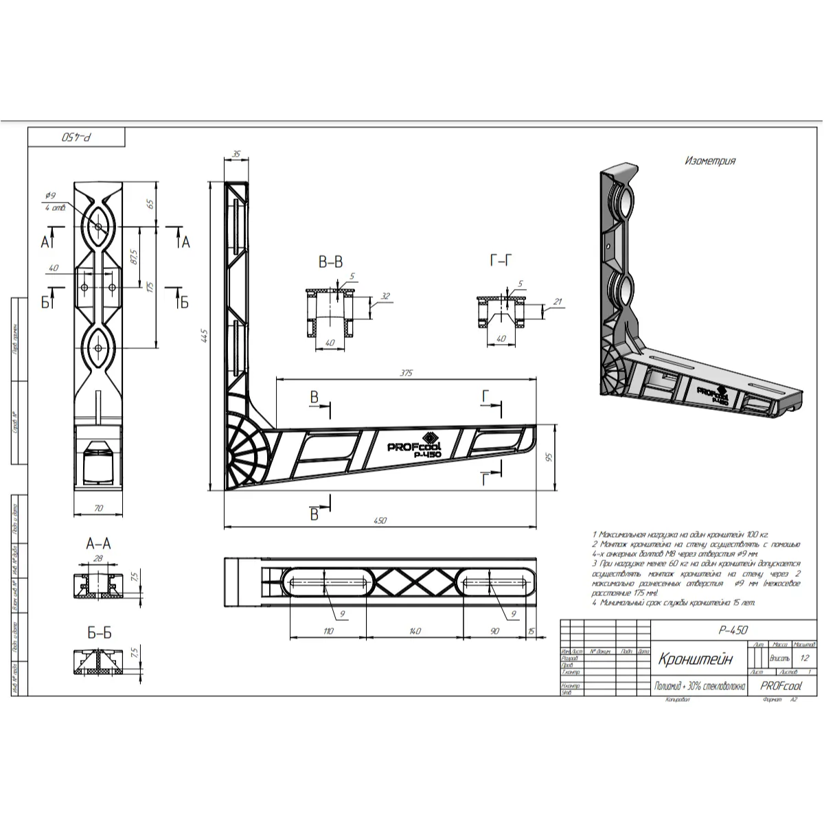 Изделие предназначено для монтажа наружных блоков кондиционеров на фасад здания. Размер 450х450мм. Кронштейн изготавливается из стеклонаполненного полиамида, что ставит его на ряду со стальными кронштейнами. Данный материал обеспечивает его надежность и долговечность использования в любых погодных условиях. Изделие представляет из себя Г-образную конструкцию с фермообразными укрепляющими элементами.