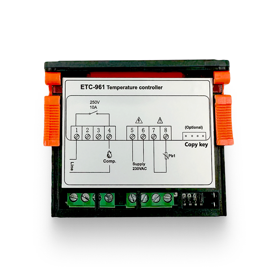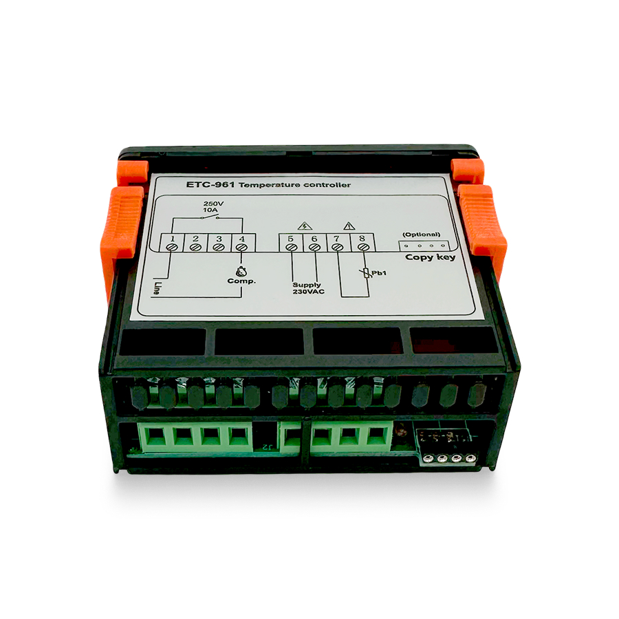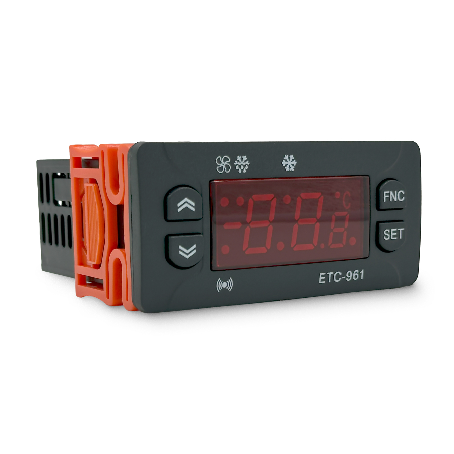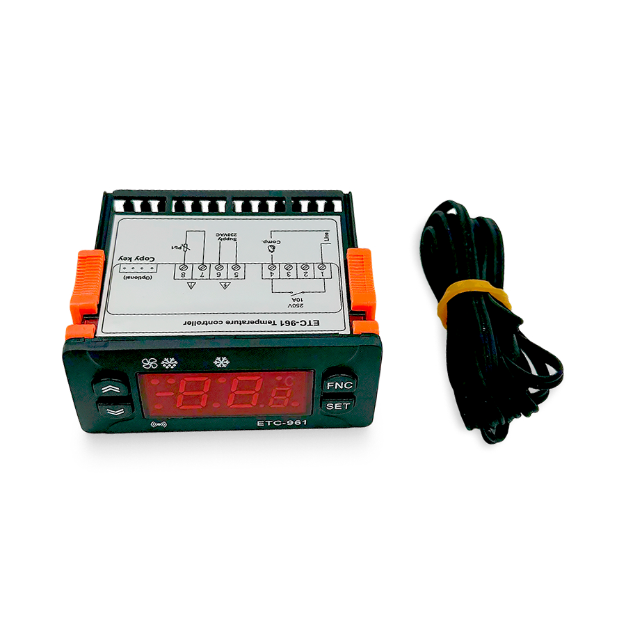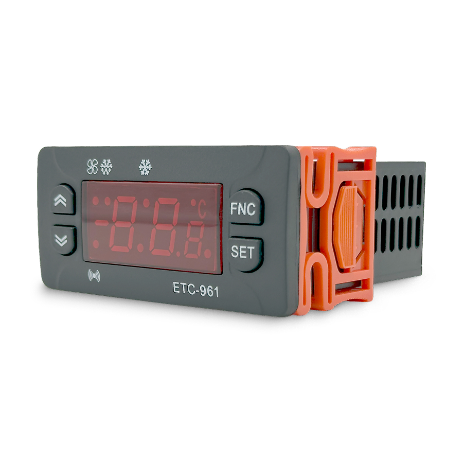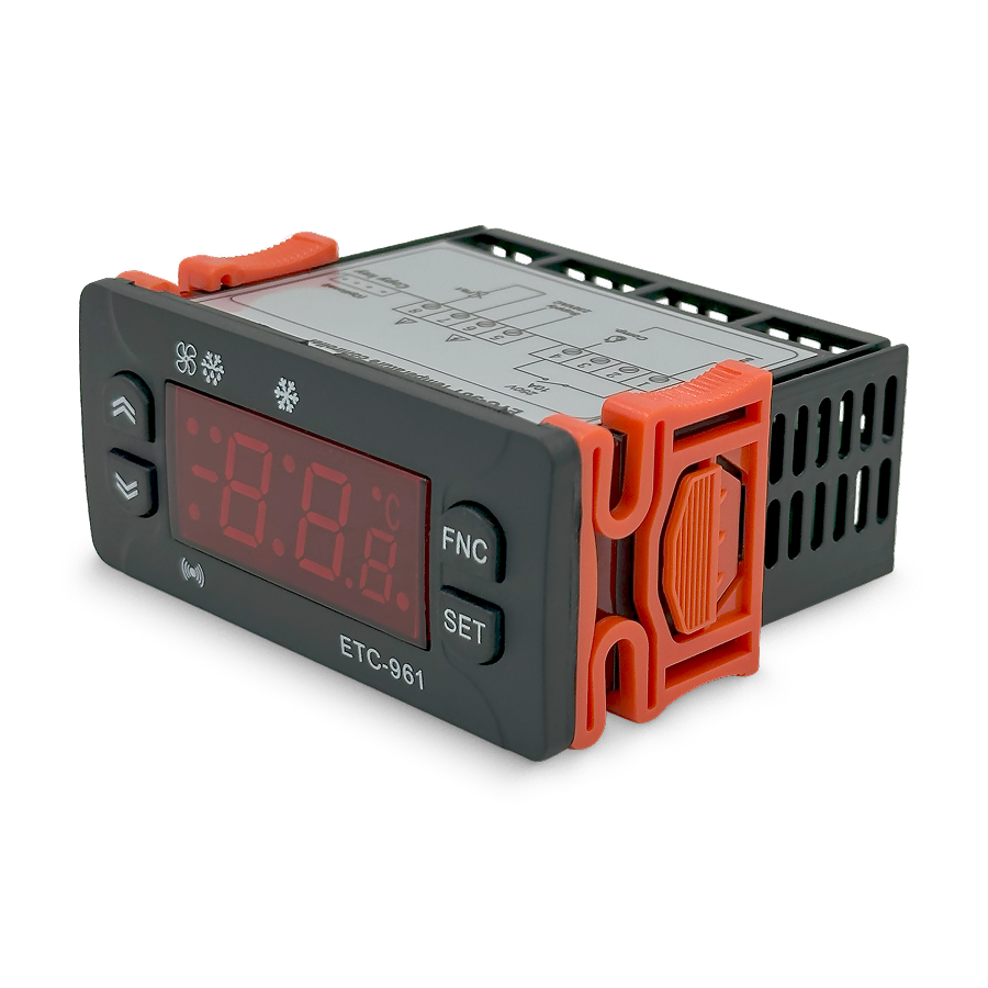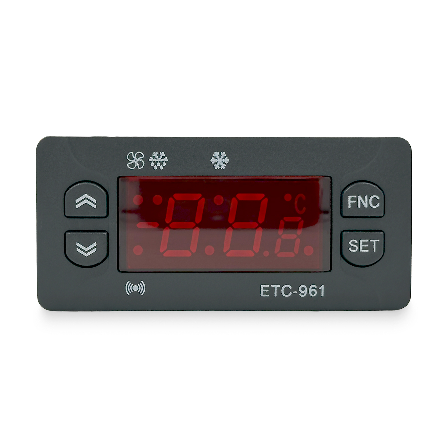 Температурный контроллер ETC-961 оснащен микропроцессором, обеспечивающим точное управление и широкие возможности настройки. Цифровой терморегулятор позволяет задавать различные параметры работы, включая задержку включения компрессора, интервалы разморозки и калибровку датчика.