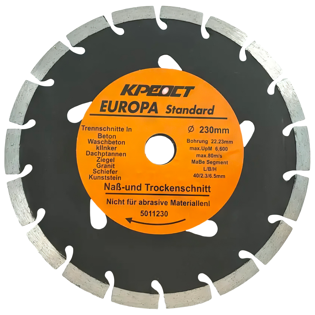 Отрезной алмазный диск используется совместно с угловыми шлифмашинами для сухой резки гранита, бетона, камня, кирпича, асфальта и других подобных материалов. Диск разделен на сегменты с компенсационными отверстиями, что повышает теплоустойчивость и способствует эффективному отводу пыли из зоны резания. Для безопасной и производительной работы необходимо соблюдать определенную цикличность: 60-90 секунд работы чередовать с 20 секундами прокрутки на холостом ходу. При этом охлаждение водой не требуется.