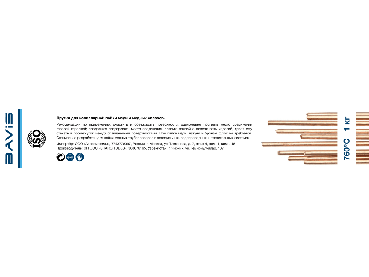 Твердый медный припой BAVIS в виде прутков для пайки медных трубопроводов в холодильных, водопроводных и отопительных системах. Процент содержания серебра: 30%. В упаковке 1 кг.