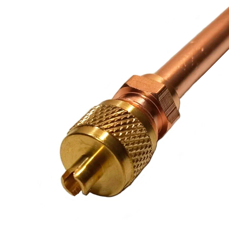Клапан "Шредера" (сервисный штуцер) с трубкой 3/8" - припаивается к трубопроводам хладагента для подсоединения шланга манометрического коллектора. Используется для измерения давление в магистрали, а также опрессовки и заправки хладагентом.