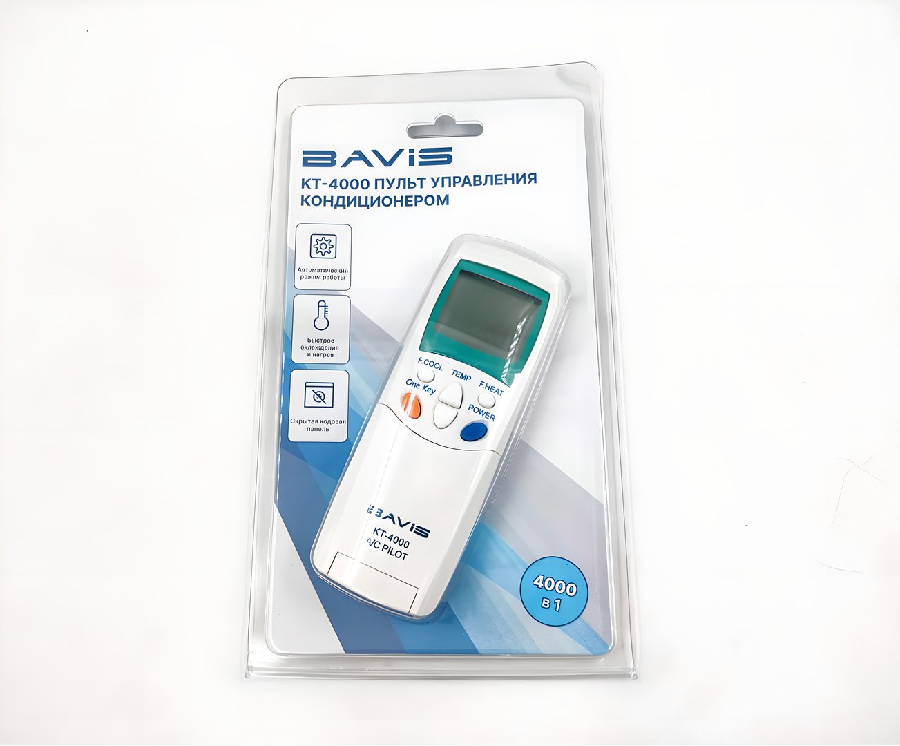 Универсальный пульт управления для кондиционеров BAVIS KT-4000 поддерживает 4000 кодов для управления моделями кондиционеров различных производителей. Обладает функциями быстрого, умного охлаждения и нагрева и регулировкой потока. Подходит для 98% кондиционеров.