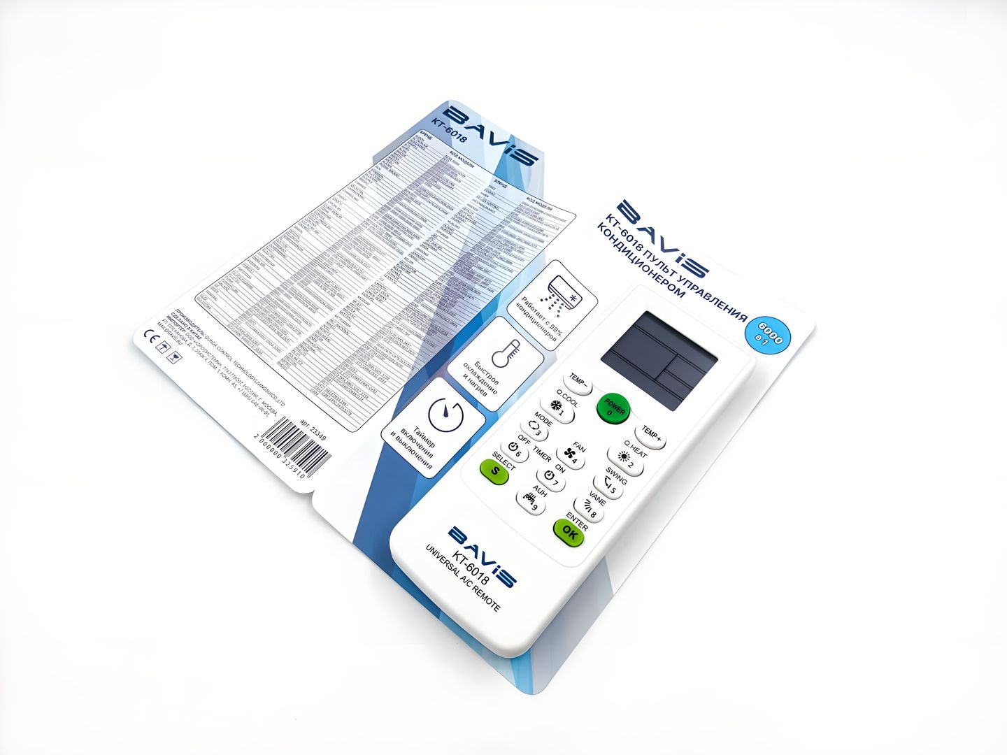 Универсальный пульт управления для кондиционеров BAVIS KT-6018 поддерживает 6000 кодов для управления моделями кондиционеров различных производителей. Обладает функцией быстрого умного охлаждения и нагрева. Подходит для 99% кондиционеров.
