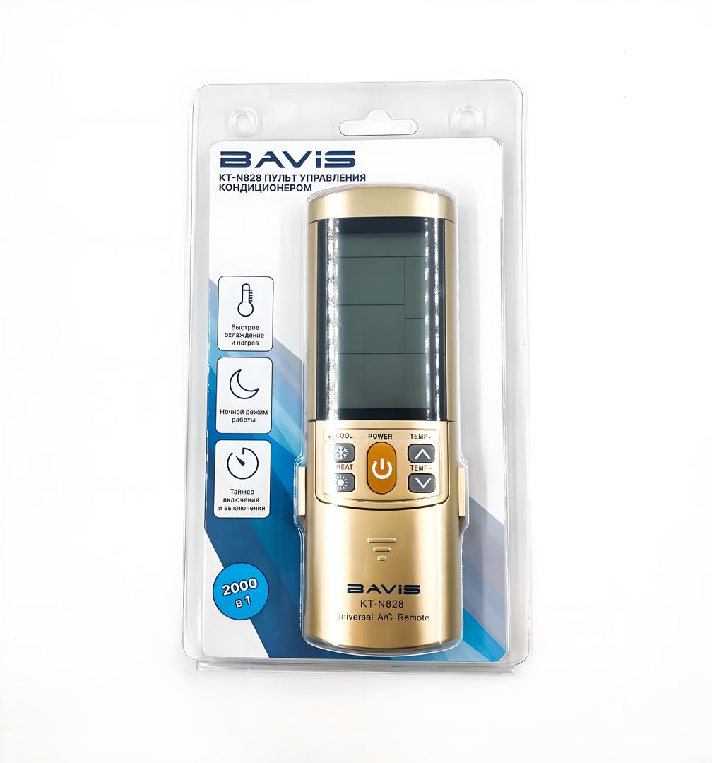 Универсальный пульт управления для кондиционеров BAVIS KT-N828 поддерживает 2000 кодов для управления моделями кондиционеров различных производителей. Обладает стильным дизайном и широким набором функций: умное охлаждение и нагрев, ночной режим, таймер, регулировка направления воздуха.