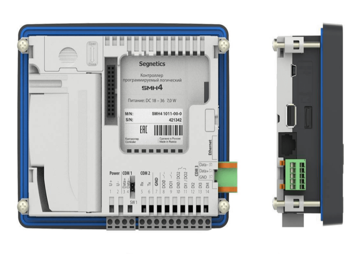 Программируемый логический контроллер (ПЛК) Segnetics SMH4 – развитие линейки панельных контроллеров, ранее представленных моделью SMH2G(i). Сочетание мощной начинки на базе 32-битного процессора с ядром