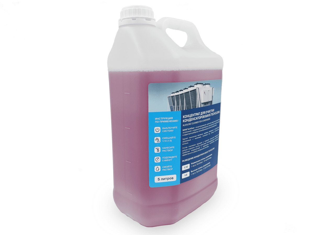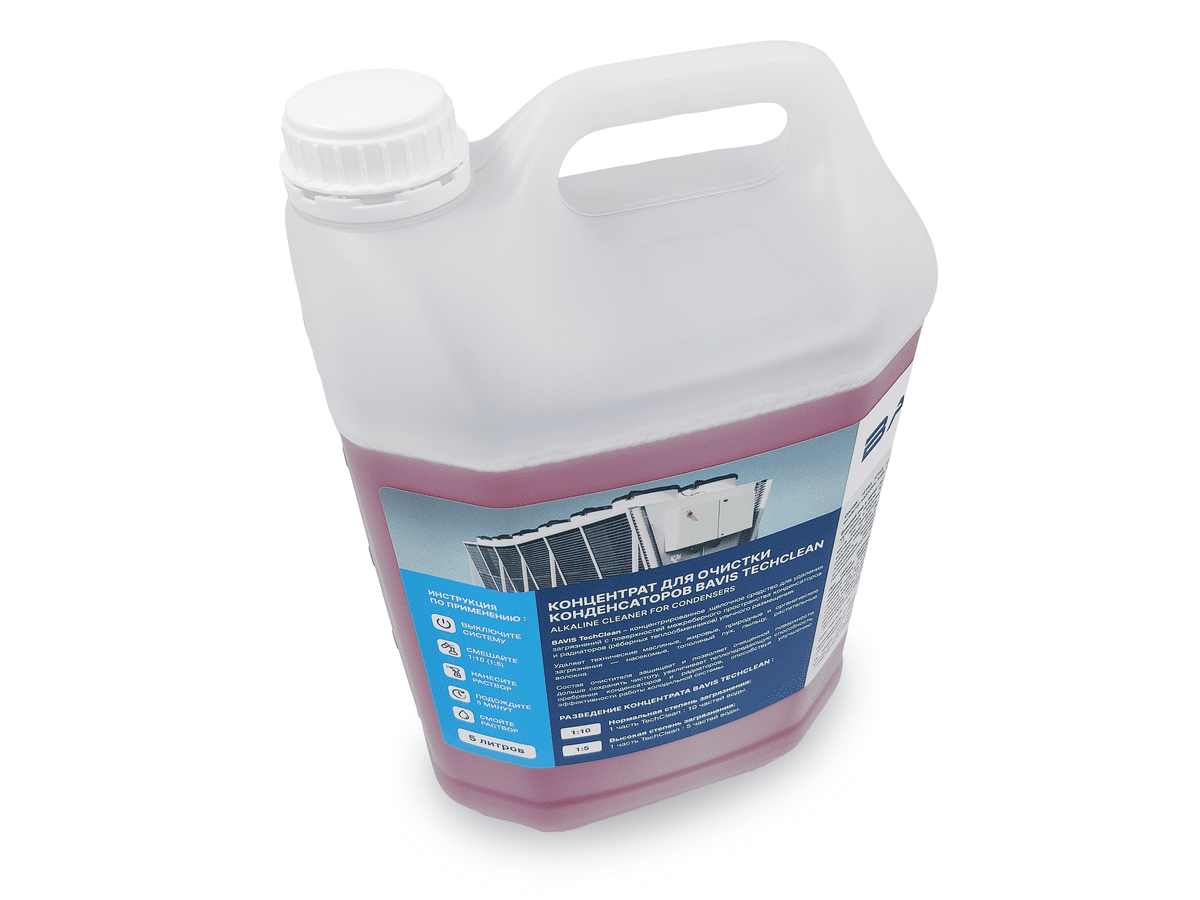 Концентрат для очистки конденсаторов BAVIS TechClean - щелочное средство для удаления загрязнений с поверхностей межреберного пространства радиаторов и конденсаторов, которые размещаются на улицах. Объем 5 литров.